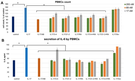 An impact of IL-17A and IL-17RA specific aptamers on IL-17A-stimulated cell proliferation (A) and IL-6 secretion (B) in PBMC. The aptamers and their combinations are designated as follows: IL-17/AB—IL-17A + monoclonal antibody (secukinumab, 10 µM); IL-17/3-4—IL-17A + aptamer 3-4; IL-17/21-2—IL-17A + aptamer 21-2; IL-17/RA—IL-17A + aptamer RA10-6; IL-17/21-2 + RA—IL-17A + aptamers 21-2 and RA10-6; IL-17/3-4 + RA—IL-17 + aptamers 3-4 and RA10-6; IL-17/Scr—IL-17A + non-aptamer control Scr. The concentrations of aptamers and control oligonucleotide are given in the legend. n = 3, *—p < 0.05.