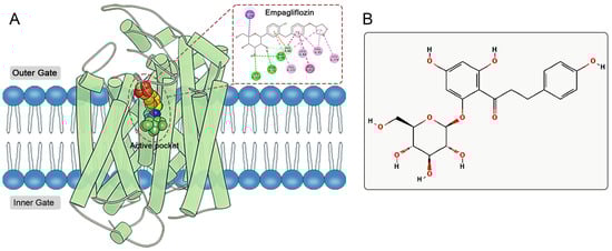 (A) Active pocket and ligand binding site of SGLT2. Empagliflozin serving as a model ligand to illustrate its interaction pattern with key amino acid residues, which are highlighted. (B) 2D structure of phlorizin.