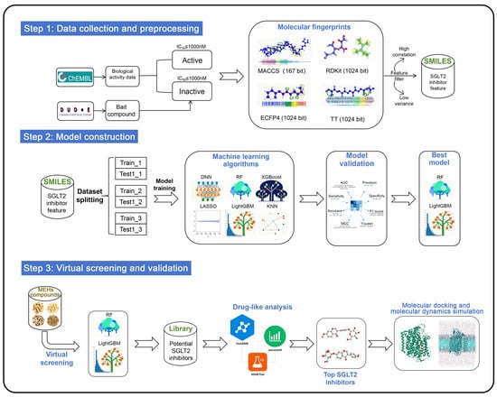 In addition, different molecular fingerprints represent compound structures in distinct ways, which may lead to discrepancies in the assessment of SGLT2 activity when models are constructed using different fingerprints. However, current virtual screening studies on SGLT2 inhibitors rely exclusively on a single type of molecular fingerprint to describe compound structural features. The integration of multiple molecular fingerprints into ML models can effectively consolidate structural information of compounds at various levels, thereby compensating for the limitations of a single fingerprint in characterization capabilities. MACCS fingerprints effectively represent the geometric and topological features of molecular structures [35], while RDKit fingerprints encode the linear arrangements of atoms and bonds [36]. Extended connectivity fingerprints radius 2 (ECFP4) utilize iterative hashing to represent cyclic atomic environments [37]. Topological torsion fingerprints (TT) provide insights into torsional and topological aspects of molecular graphs by capturing sequences of connected atomic environments [38]. This study constructs an integrated virtual screening pipeline by incorporating MACCS, RDKit, ECFP4, and TT to identify potential SGLT2 inhibitors from a compound library of eight MFH herbs. The complete research methodology is illustrated in Figure 2.