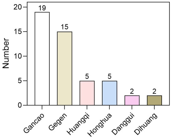 We utilized LightGBM and RF to create a set of four distinct fingerprint models for assessing 858 compounds derived from MFH herbs. The outcomes of this virtual screening are presented in Supplementary File S3. The analysis revealed that 204 compounds were predicted as potential SGLT2 inhibitors. However, the majority of compounds were approved by only one or two models. To enhance the reliability of the results, only those compounds recognized as active by all four models were selected, resulting in a final list of 44 potential inhibitors (Supplementary File S4). As shown in Figure 6, these compounds are primarily distributed among herbs such as Gegen, Gancao and Huangqi, with Gegen and Gancao exhibiting a higher distribution ratio. These findings suggest that Gegen and Gancao may serve as important herbal resources rich in SGLT2 inhibitors.