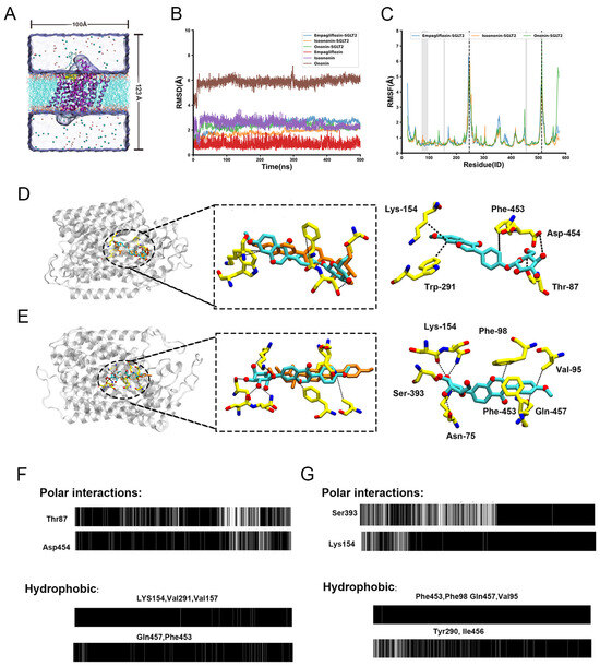 Molecular Dynamics (MD) simulations reveal the stability and interaction patterns of Isoononin and Ononin with SGLT2. (A) Schematic representation of the initial simulation system, showing an inhibitor-bound SGLT2 complex embedded in a hydrated POPC lipid bilayer. The initial binding pose was determined from molecular docking. (B) Time evolution of the Root-Mean-Square Deviation (RMSD). The RMSD of the protein Cα atoms is plotted for the SGLT2 complexes with Empagliflozin, Isoononin, and Ononin. Additionally, the RMSD of the heavy atoms for each respective inhibitor is shown, calculated after aligning to the protein backbone. (C) Per-residue Root-Mean-Square Fluctuation (RMSF) profiles for the Cα atoms of SGLT2 in each complex, calculated over the 500 ns simulation. The gray shaded area highlights the inhibitor binding region, while dashed lines indicate key flexible loop regions. (D) Schematic representation of the binding modes and predominant interactions for Isoononin (D) and Ononin (E) within the SGLT2 active site. The left panels show the binding snapshot within the protein scaffold. The central panels illustrate the superimposition of the initial inhibitor pose calculated by AutoDock (orange carbons) with the representative MD simulation snapshot (cyan carbons). Key residues forming stable interactions are highlighted in the right panels, Black dashed lines denote specific intermolecular interactions, including hydrogen bonds and hydrophobic contacts. (F,G) Barcode representation of the timelines of typical protein-inhibitor contacts for Isoononin (F) and Ononin (G). The upper panels show the persistence of specific hydrogen bonds, and the lower panels show hydrophobic interactions over the 500 ns trajectory. A black bar indicates that the interaction is present in that simulation frame.