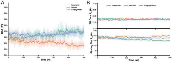 (A) Structural and interaction stability of SGLT2 complexes over 500 ns. Contact Surface Area (CSA) between inhibitors and protein. (B) Radius of Gyration (Rg) for the 14-TM helix bundle (top) and binding site residues within 3 Å (bottom). Solid lines represent moving averages; shaded regions denote raw trajectory data.