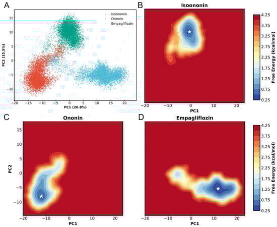 Furthermore, Free Energy Landscapes (FEL) were constructed based on the PC1 and PC2 coordinates. Each landscape exhibits a well-defined and energy basin, with the global energy minimum for each complex marked by a white star. For the Isoononin and Ononin, the protein resides in a single energy well, indicating restricted conformational motion and good stability in protein. Meanwhile, the Empagliflozin complex explores a slightly broader energy basin, which might reflecting a degree of localized flexibility while remaining within a stable equilibrium state.