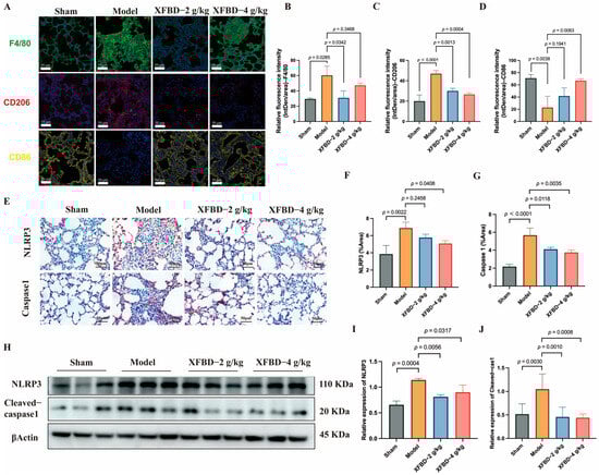 Building upon the initial in vitro experiments, which demonstrated that XFBD inhibits NLRP3 activation in peritoneal macrophages and regulates macrophage phenotypic transformation, this study aims to further substantiate and explore the inhibitory effects of XFBD on NLRP3 activation and macrophage polarization in a murine model of silicosis. We began by analyzing F4/80-positive macrophages in the lung tissue of mice. Immunofluorescence analysis revealed an increased presence of F4/80-positive cells in silicosis model mice, predominantly localized within fibrous nodules. Notably, treatment with XFBD resulted in a reduction of this accumulation. Additionally, our findings indicated that XFBD significantly downregulated the expression of CD206, a marker of M2 macrophage polarization, while upregulating CD86, a marker associated with M1 polarization (Figure 2A–D). The activation of the NLRP3 inflammasome promotes M1 macrophage polarization, thereby enhancing IL-1β production and exacerbating the inflammatory response [26,27]. Inhibition of the NLRP3 inflammasome has the potential to alleviate both inflammation and fibrosis [28]. We evaluated the macrophage polarization process by modulating NLRP3. IHC analysis was employed to visualize the in situ expression of NLRP3 and Caspase-1 in lung tissues. CS increased the expression of NLRP3 and Caspase-1, and XFBD dramatically reversed the elevation of NLRP3 and Caspase-1 (Figure 2E–G). Consistently, Western blotting results demonstrated that the protein levels of NLRP3 and Cleaved-Caspase-1 were elevated in the model group, which could also be reversed by XFBD treatment at a high dosage (4 g/kg) (Figure 2H–J). These results suggest that XFBD treatment can significantly inhibit CS-induced inflammasome activation in pulmonary fibrosis. No obvious pathological changes (e.g., hepatocellular necrosis, renal tubular damage) were observed in liver/kidney sections of mice in the XFBD-treated groups (4.0 g/kg and 2.0 g/kg) compared with the sham group. These findings confirm that the experimental doses of XFBD did not induce toxic damage to key metabolic organs in mice (Supplementary Figure S1B).
