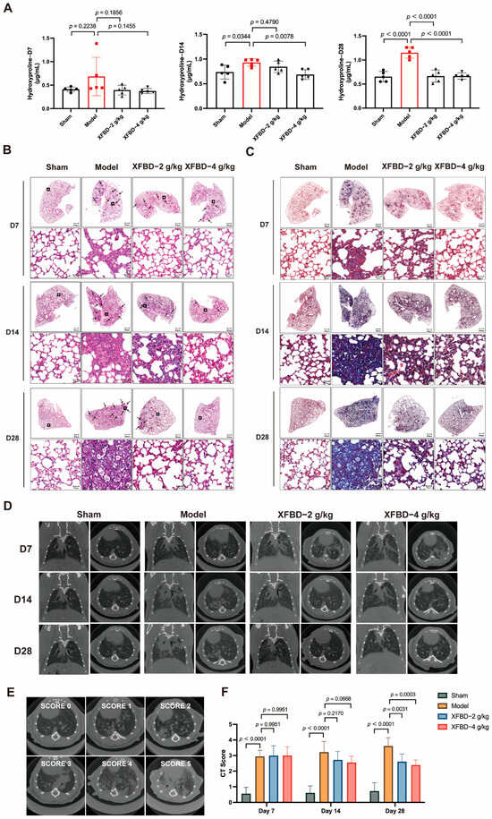Subsequently, Micro CT scanning was utilized to provide a comprehensive assessment of the dynamic changes in pulmonary architecture and the severity of fibrotic remodeling. In the untreated model group, there was a notable progressive increase in lung shadow attenuation from day 0 to day 14, indicating the onset and advancement of pulmonary inflammation and fibrosis. By day 28, the lung condition of the mice had significantly worsened, with the development of pulmonary parenchymal lesions characterized by the presence of ground-glass opacities in the middle and lower lung fields, as well as small nodules beneath the pleura. Notably, a 7-day treatment with XFBD at doses of 2 g/kg and 4 g/kg resulted in a substantial reduction in the diffuse high-density shadows within the lungs. Furthermore, an additional 7-day treatment with XFBD led to a further decrease in the lesion area (Figure 4D–F). Overall, the results demonstrated that XFBD exhibits a distinct protective pharmacodynamic effect during the dynamic progression of the disease, specifically during the transition from acute inflammation to fibrosis. This effect is evidenced by a notable improvement in overall lung function and a reduction in the pathological burden on the lungs.