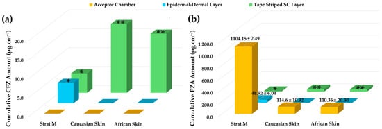 The primary objective of this study was therefore twofold: (i) to evaluate the formulation performance and permeation behavior of a CFZ/PZA dermal emulsion, considered optimal in terms of its physical characteristics, and (ii) to correlate permeation data obtained using Strat-M® with those generated using ex vivo full-thickness human skin. By directly comparing these models, this work aims to assess the feasibility of Strat-M® as a surrogate membrane for early-stage screening of complex dermal FDC formulations, with the potential to reduce reliance on human tissue while maintaining predictive relevance.