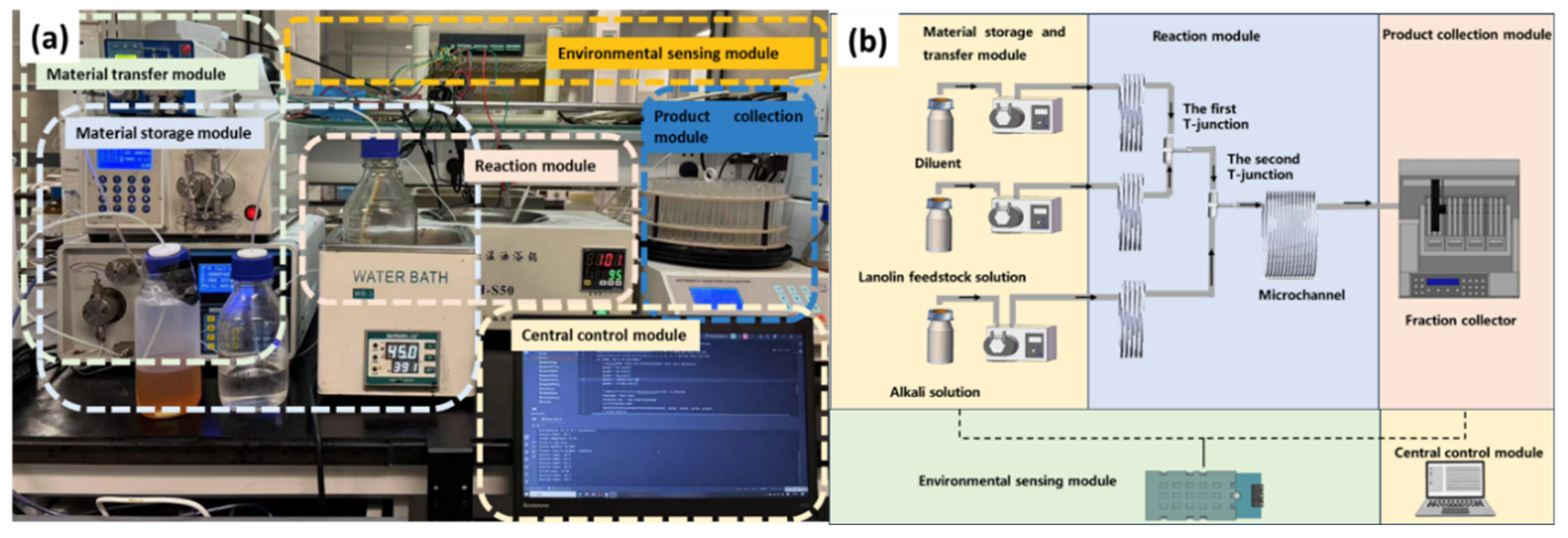- Operational parameter calculation node: Converts experimental parameters, including reaction temperature, reaction time, the mass fraction of the lanolin solution, and alkali dosage, into hardware control parameters such as pump flow rate, residence time, and oil bath temperature. Pump flow rate and residence time are calculated using Equations (1)–(5):where 1 represents the density of the lanolin feedstock solution; represents the mass fraction of the lanolin feedstock solution; represents the mass fraction of the lanolin solution; represents the mass fraction of the alkali solution; represents the density of the alkali solution; represents the density of the diluent; represents the alkali dosage; represents the reaction time; represents the lanolin feedstock solution transfer time from the pump outlet to the second T-junction; represents the equilibration time (set to 2 min); represents the tubing volume between the pump and the second T-junction (set to 10 mL). represents the residence time; represents the volumetric flow rate of the lanolin feedstock solution; represents the volumetric flow rate of the alkali solution; represents the volumetric flow rate of the diluent; represents the volume of the PTFE coil used for the reaction.
