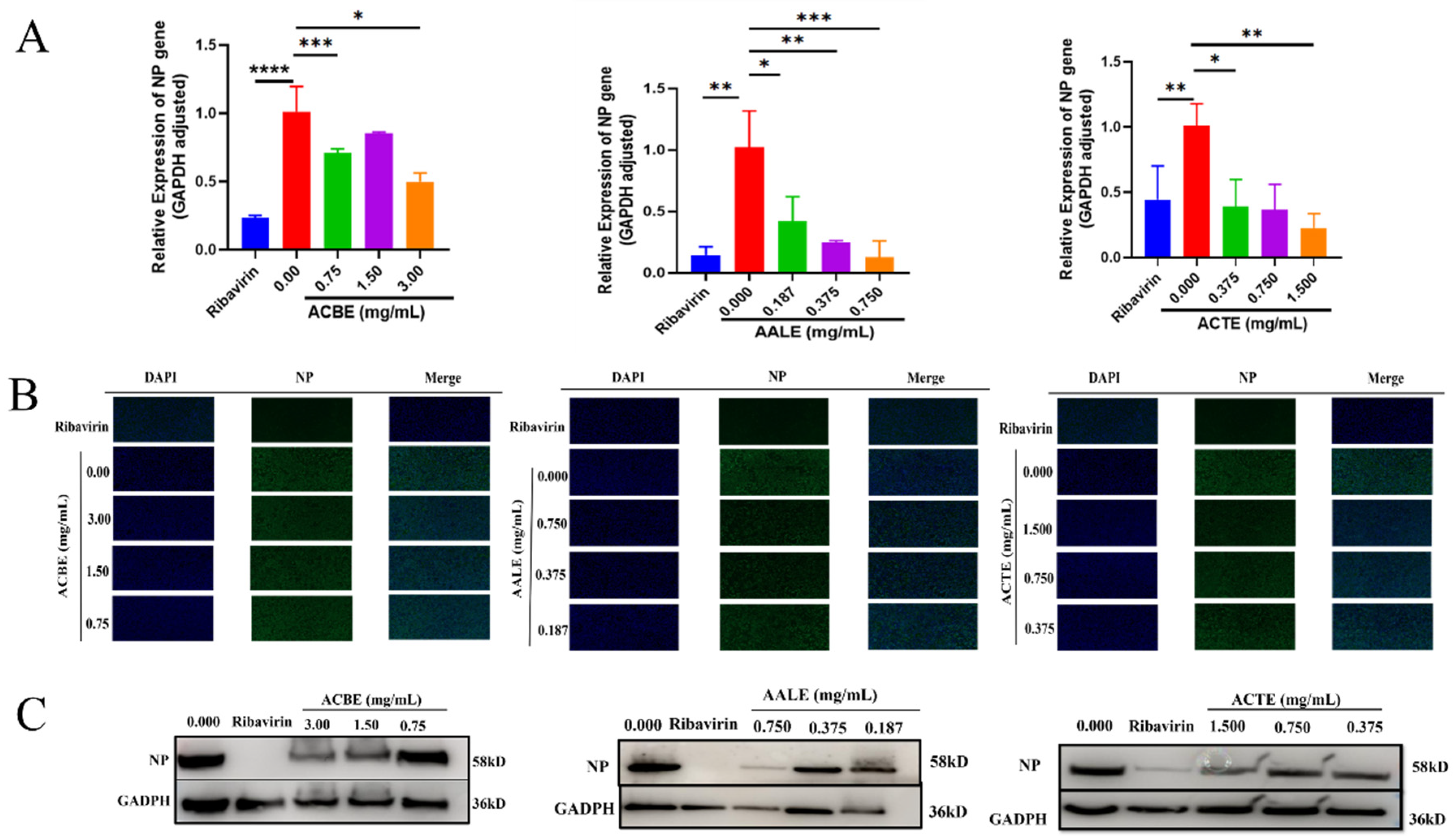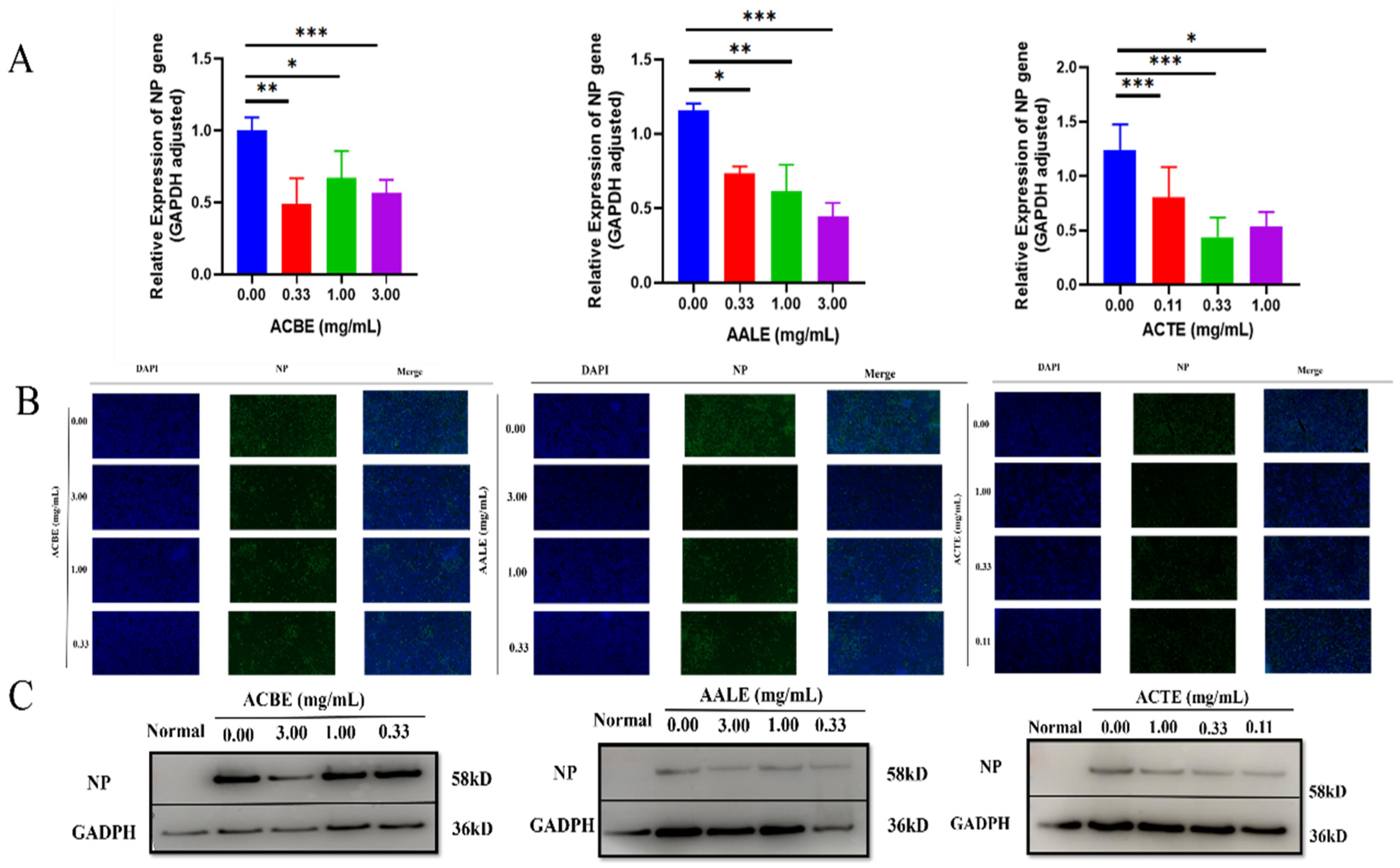 4.14. Immunofluorescence Was Used to Investigate the Expression of the NP Protein in Different Treatment Groups of MDCK Cells