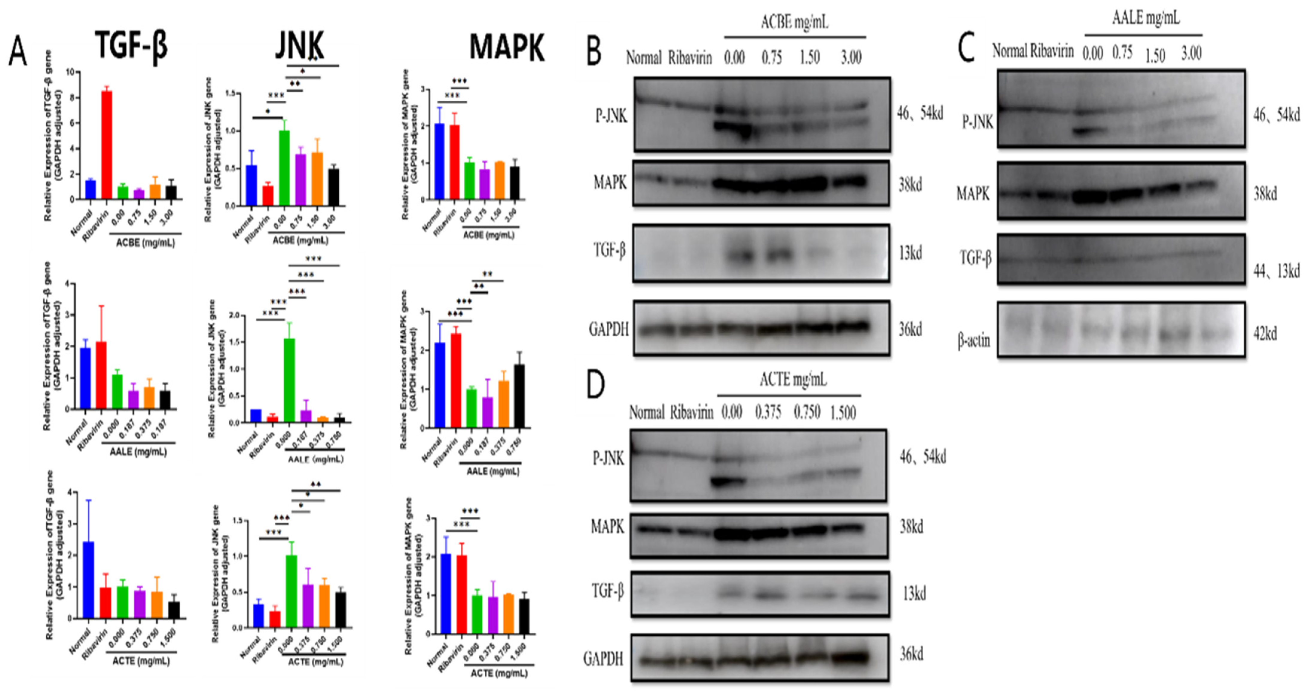 2.4.6. Effect of Artemisia L. Extracts on the Expression of Proteins Related to TGF-β/MAPK/P-JNK Signaling Pathway in MDCK Cells in the Treatment Group