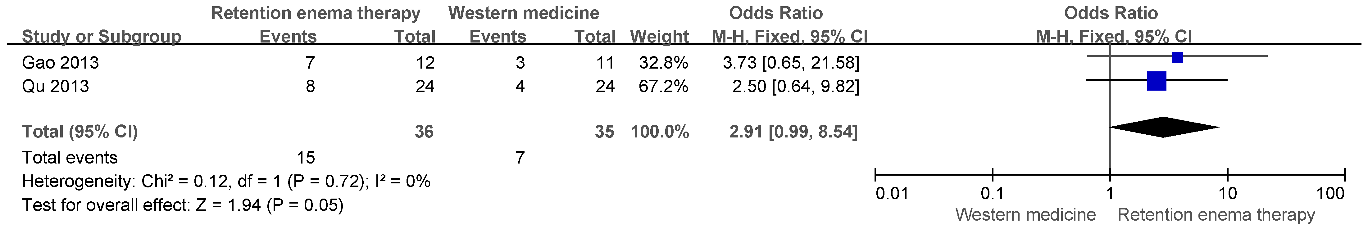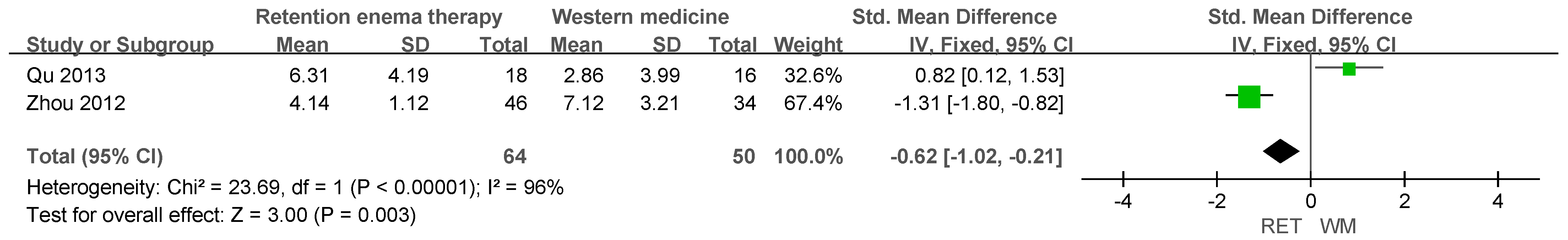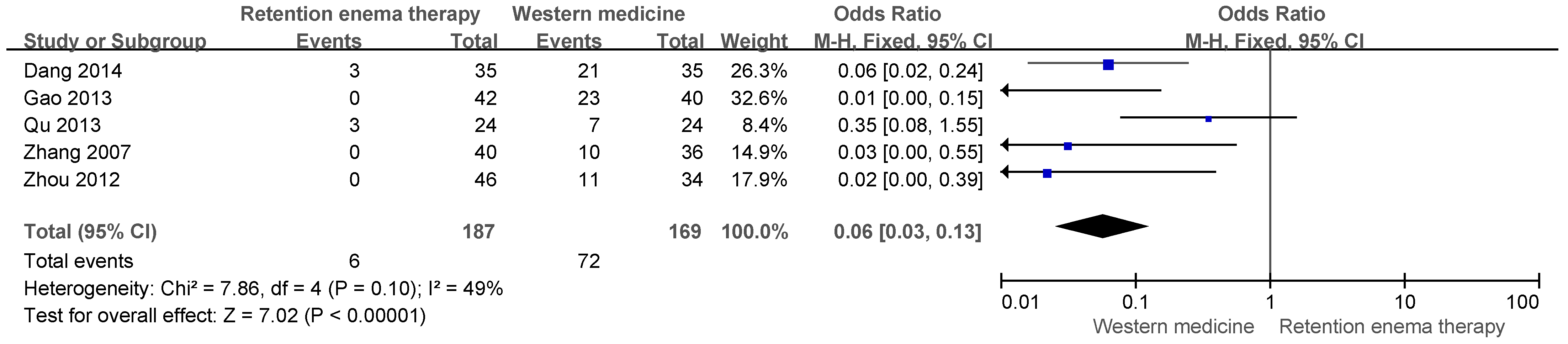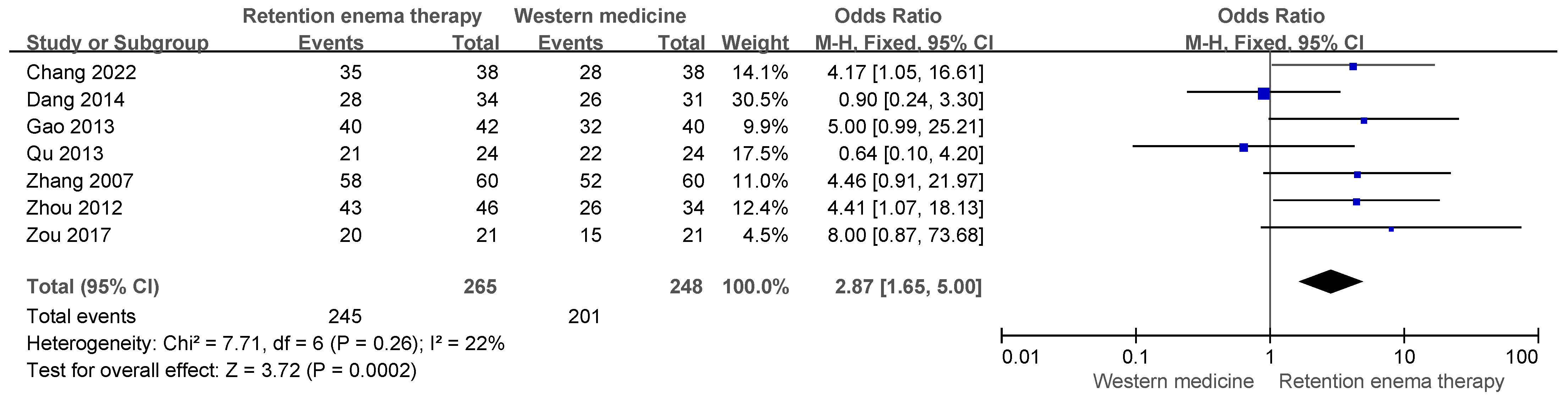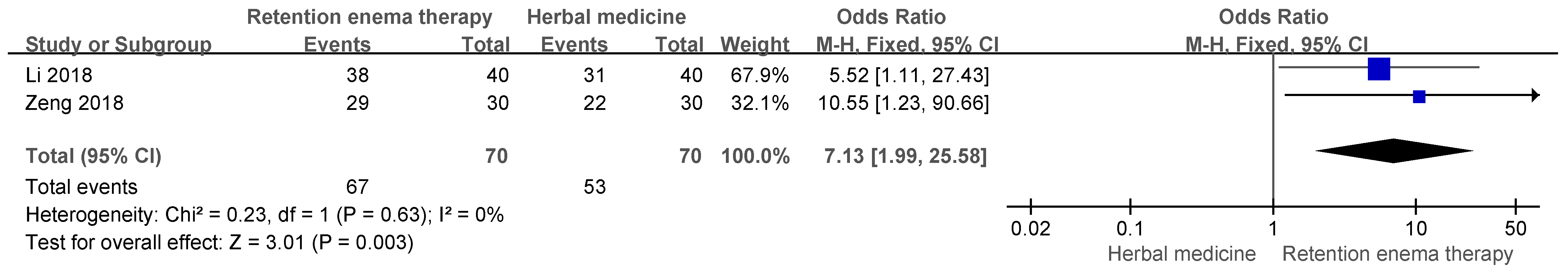 | Li (2018) [20] | Integrated Traditional Chinese and Western Medicine diagnostic criteria | 40:40 | Retention enema therapy | Herbal medicine (oral) 3 capsules, three times/day | Total effective rate | 95.0% vs. 77.5% a | N.R. | N.R. |