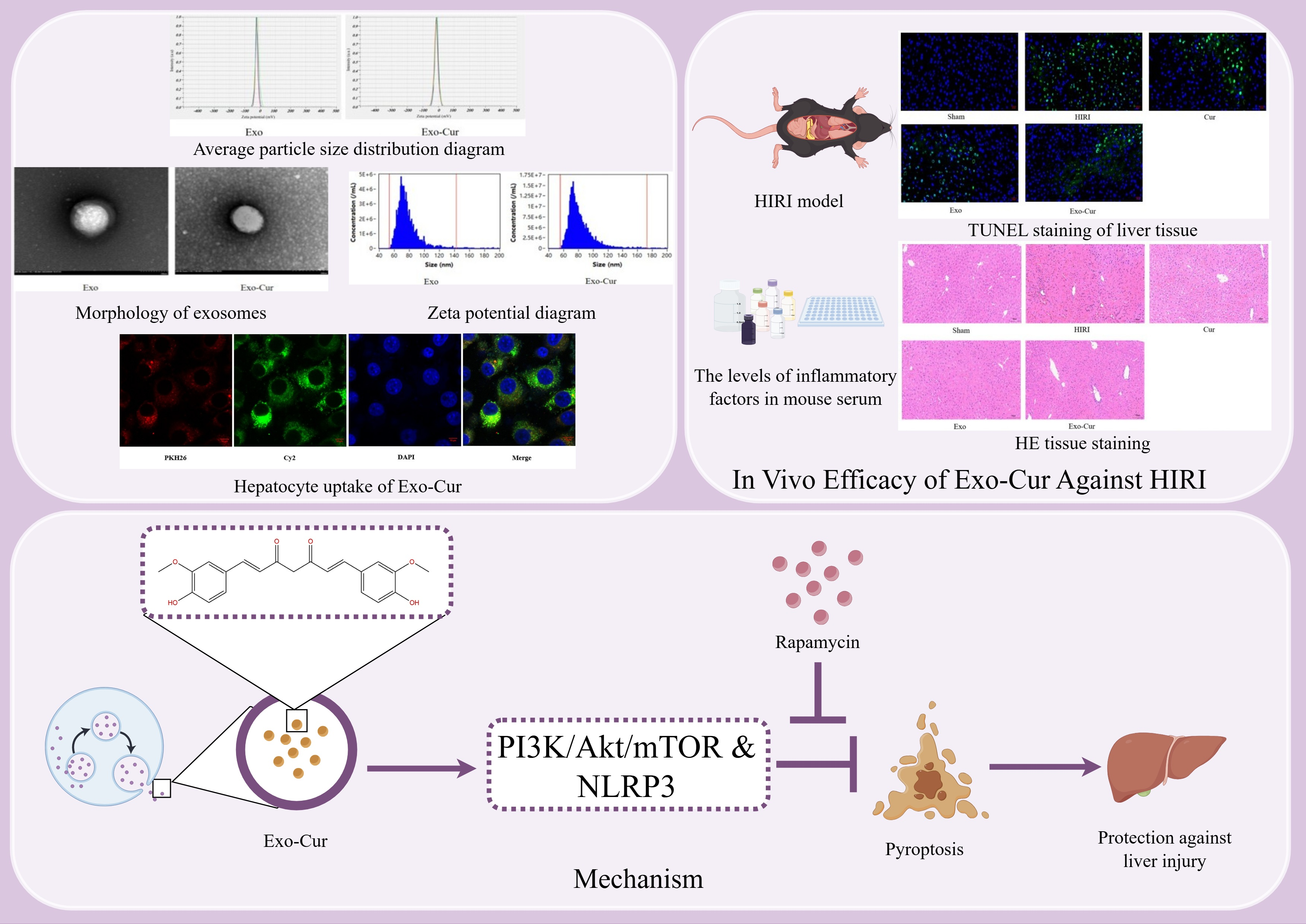 12], the synergistic effect of combining curcumin with MSC-derived exosomes and the specific signaling pathways involved in pyroptosis inhibition remain poorly understood. Furthermore, the preparation method of Exo-Cur and its physicochemical properties, which are crucial for its therapeutic efficacy, need to be thoroughly characterized. Therefore, this study aims to construct an efficient and stable Exo-Cur delivery system and systematically evaluate its physicochemical properties and cellular uptake efficiency. Additionally, it will explore its protective effect and potential mechanism in inhibiting pyroptosis in a HIRI model. By focusing on the regulatory role of the PI3K/Akt/mTOR signaling pathway in Exo-Cur-mediated pyroptosis inhibition, this study intends to fill the existing knowledge gap and provide a novel and effective nano-therapeutic strategy for the clinical treatment of HIRI.