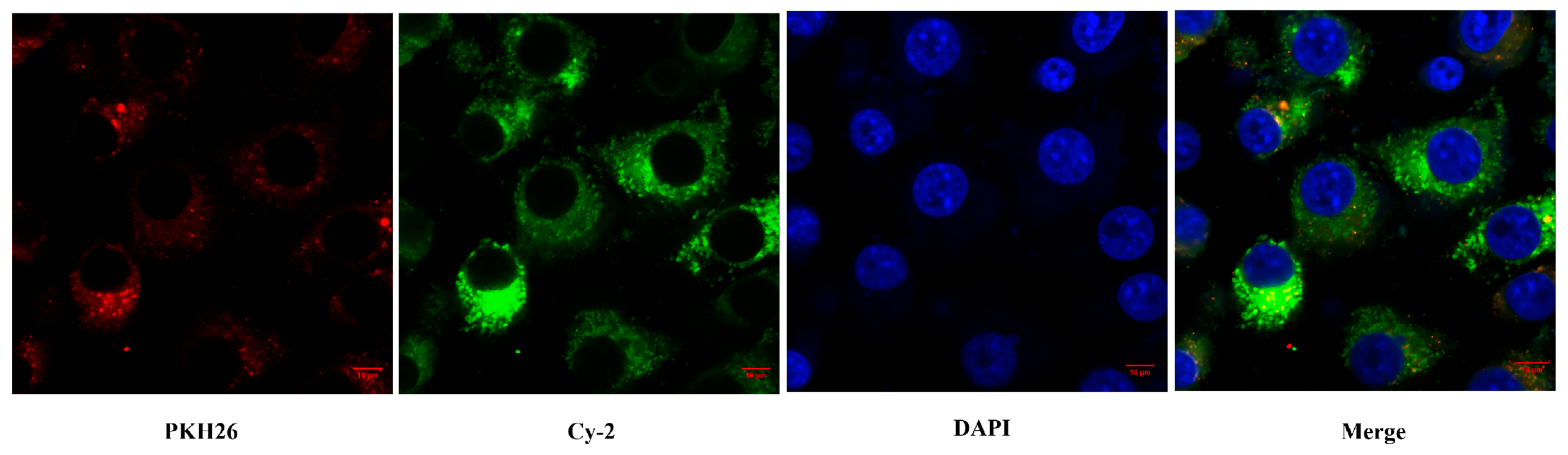 PKH26 fluorescent dye (Umibio, Shanghai, China) was used to label the Exo-Cur membrane structure. Exo-Cur suspension was mixed with PKH26 staining solution at a final concentration of 2 μmol/L and incubated at 37 °C for 10 min. An equal volume of fetal bovine serum was then added to terminate the staining reaction. The mixture was centrifuged at 4 °C at 100,000 rpm for 70 min to remove free dye, and the precipitate was resuspended in PBS. AML12 cells were seeded in culture dishes suitable for confocal laser scanning microscopy. During the reoxygenation phase, PKH26-labeled Exo-Cur was added and incubated for 12 h. The culture medium was discarded, and the cells were washed twice with PBS, then fixed with 4% paraformaldehyde for 20 min. Subsequently, the cells were incubated with DAPI staining solution at room temperature in the dark for 5 min to stain the nuclei, followed by sealing with an anti-fade mounting medium. Observations were made under a laser confocal microscope, with red fluorescence (PKH26) tracing the Exo-Cur membrane, green fluorescence (Cy2) tracing curcumin, and blue fluorescence (DAPI) indicating cell nuclei. The distribution and uptake of Exo-Cur within the cells were then analyzed.