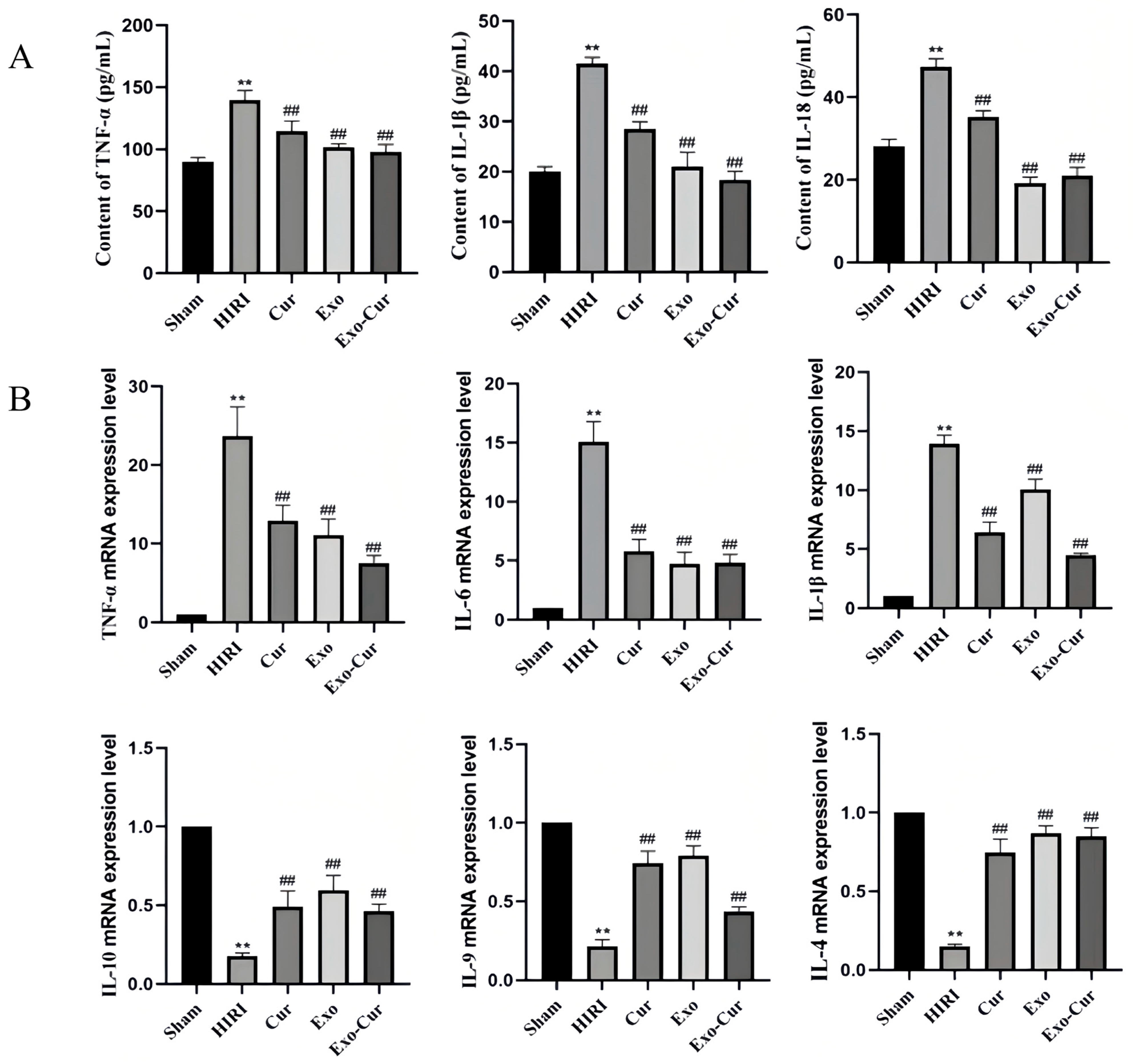 26]. Regarding inflammatory regulation, Exo-Cur inhibited the expression levels of pro-inflammatory factors—TNF-α, IL-1β, IL-6, and IL-18—and promoted the generation of anti-inflammatory factors—IL-4, IL-9, and IL-10—indicating its ability to modulate the immune microenvironment balance in damaged livers [