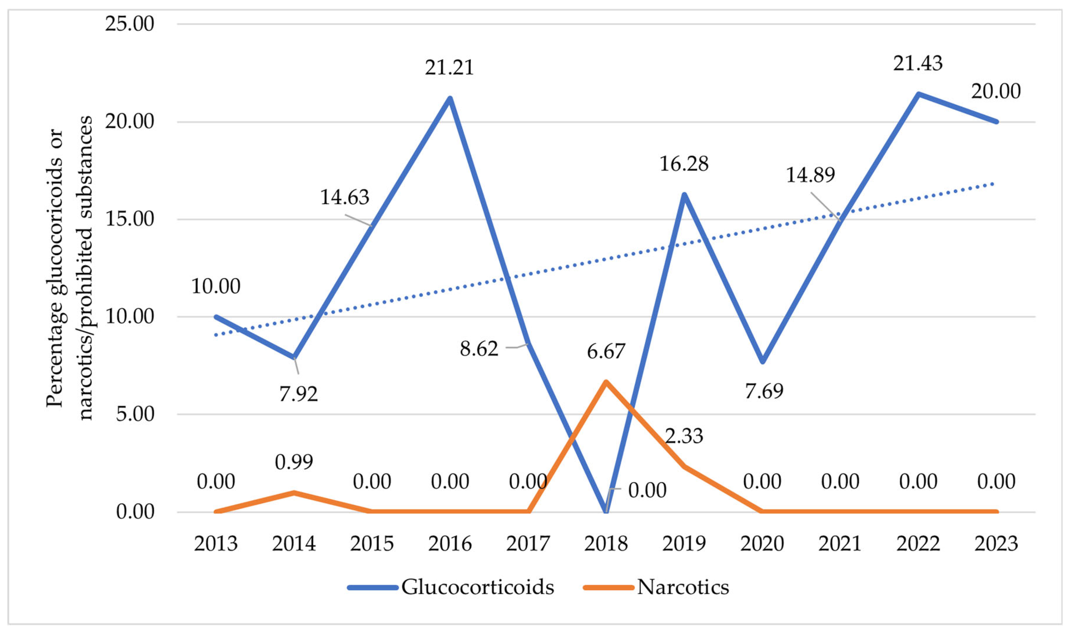| Year | Athletes Tested for Doping | NSAIDs n (%) | Glucocorticoids n (%) | Narcotics n (%) | Prohibited Substances | Positive Athletes |