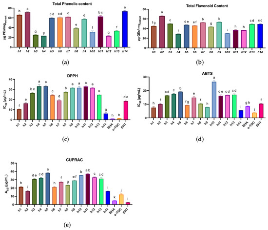 CUPRAC A0.5 values ranged from to (Table 3). h14 showed the greatest reducing power (lowest IC50), and h5 was also notable. h4, h10, and h11 were in the 30– range. h1, h6, h7, h8, and h9 showed intermediate reducing powers (20–). Controls: BHA , -TOC , BHT . See Figure 1e.