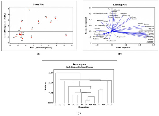 Fourteen Hypericum extracts (13 species) were analyzed for their chemical composition using HPLC and LC–HRMS. Principal component analysis (PCA) and hierarchical cluster analysis (HCA) were performed on 40 compounds. According to the PCA, PC1 accounted for 26.5% of the total variance and PC2 accounted for 19.1%. The score and loading plots are shown in Figure 3a,b, respectively. Based on LC–HRMS and HPLC data, h1 was clearly separated from the remaining species. The closest sample to h1 was h14, whereas h4, h5, h10, h12, h9, h11 and h7 clustered together by virtue of a shared compound set. In parallel, h3 differed from the others owing to the higher levels of apigenin, ascorbic acid, salicylic acid, p-coumaric acid, myricetin, ellagic acid and cirsimaritin. The loading plot visualizes the drivers of separation.