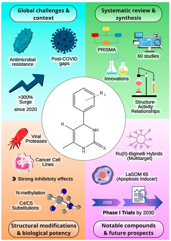 | Content Focus | Studies addressing synthesis (e.g., Biginelli variants, green catalysis [1,2]), SAR (e.g., functional group modifications [3,4,5,6,7,8,9,10,11]), biological activity (e.g., antimicrobial, antiviral, anticancer [15,16,17,18,19,20,21,22,23,24,25,26,27,28,29,30]), or preclinical/clinical data (e.g., pharmacokinetics, toxicity [16,19]) | Non-relevant topics: Studies not involving DHPM-thiones/DHPs (e.g., unrelated heterocycles without Biginelli context) |