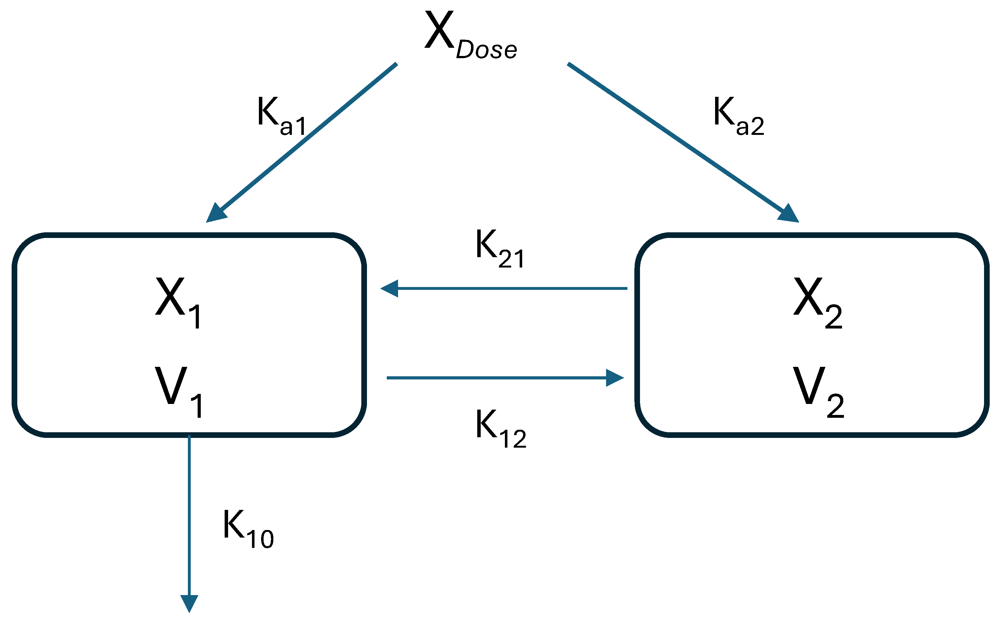 2 are the amounts of drug in the central compartment (systemic circulation and elimination organs) and the brain, respectively. V