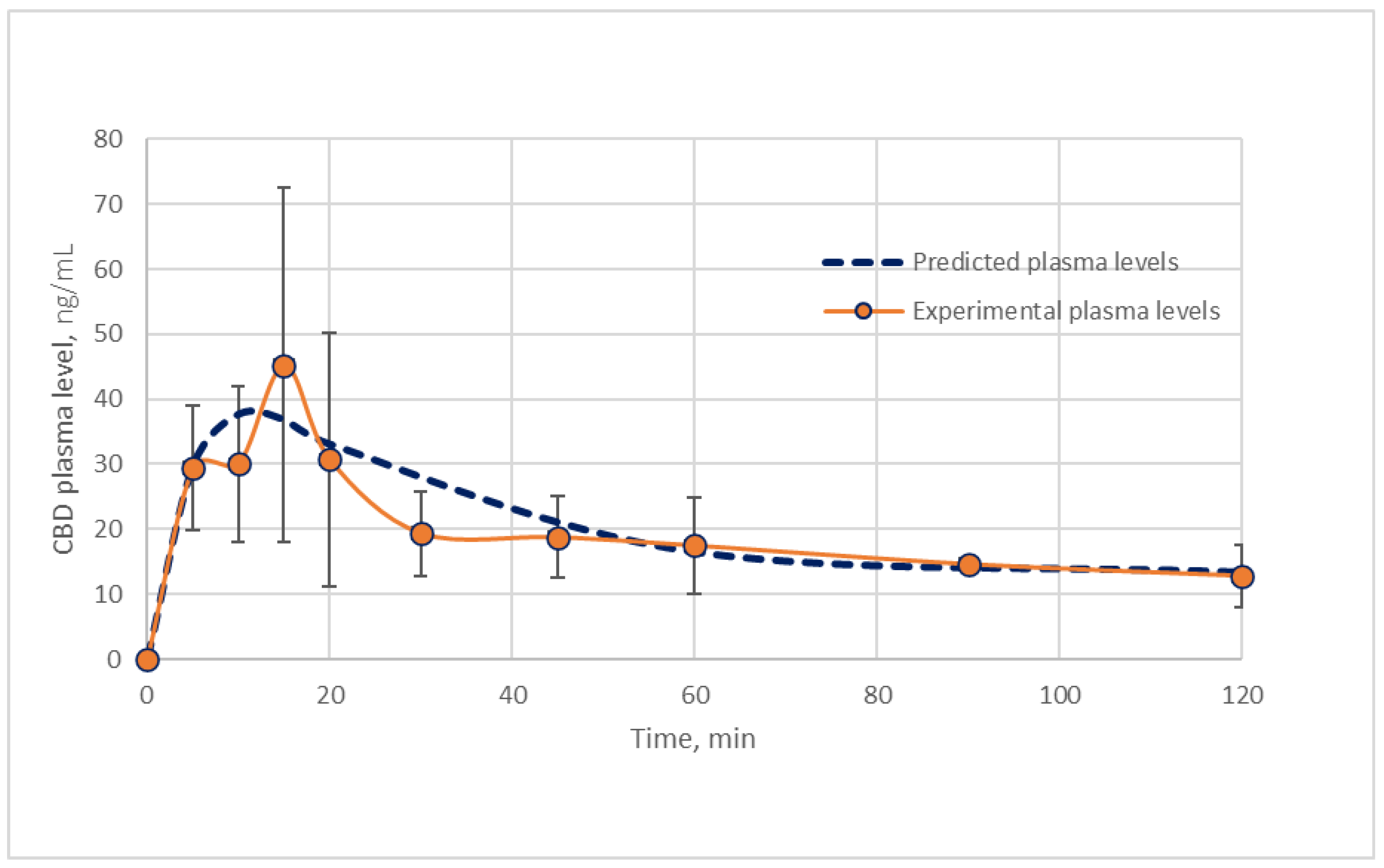 22]. On the other hand, the full bioavailability provided by the invasive IV administration of hydroalcoholic CBD solutions for injection cannot naturally be medically practiced; however, it is definitely required for pharmacokinetic evaluation of CBD and other cannabinoids. The intranasal administration of CBD, which is non-invasive and compliant, may be a good alternative to the oral administration if an appropriate formulation is applied. In particular, the formulation of nano-sized particles is one of the best alternatives for brain targeting via the nasal route. Cannabidiol pharmacokinetics was evaluated after intranasal administration of CBD in nanoparticles to rats, while each animal was used to represent a single timepoint for plasma and brain level. Doses of 100 µg of CBD (0.39 ± 0.04 mg/kg body weight), loaded in 5% divanillin-crosslinked starch-based nanoparticles (SNPs), were intranasally administered to the rats (20 μL volumes/nostril × 2).