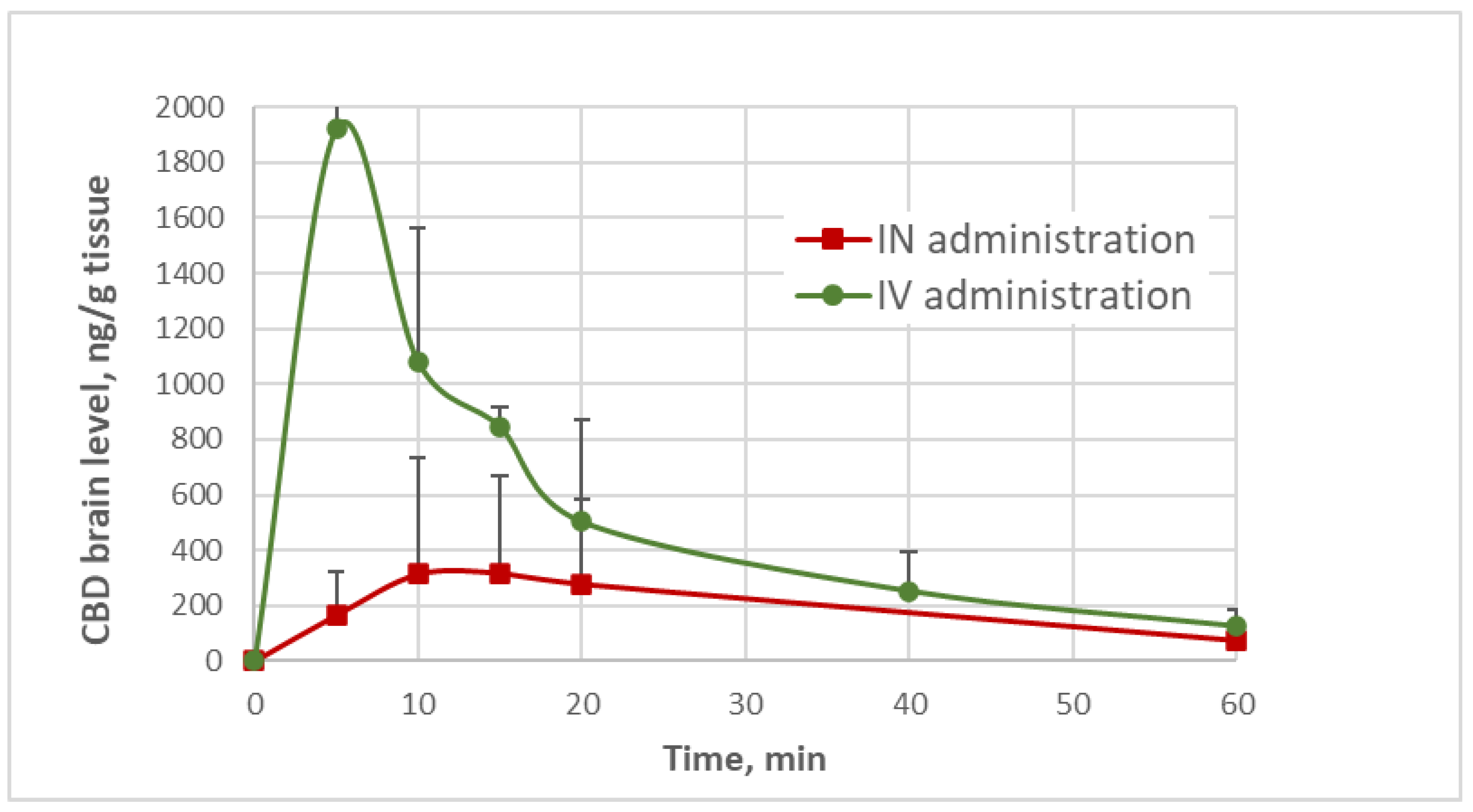 brain pharmacokinetic profiles of CBD after IN and IV administrations were obtained after analysis of the organs removed from the animals at predetermined timepoints along with the plasma sampling; thus, each animal was used to represent a single timepoint for plasma and brain level, as described previously. The pharmacokinetic profiles in the brain organ following the two administrations are presented in