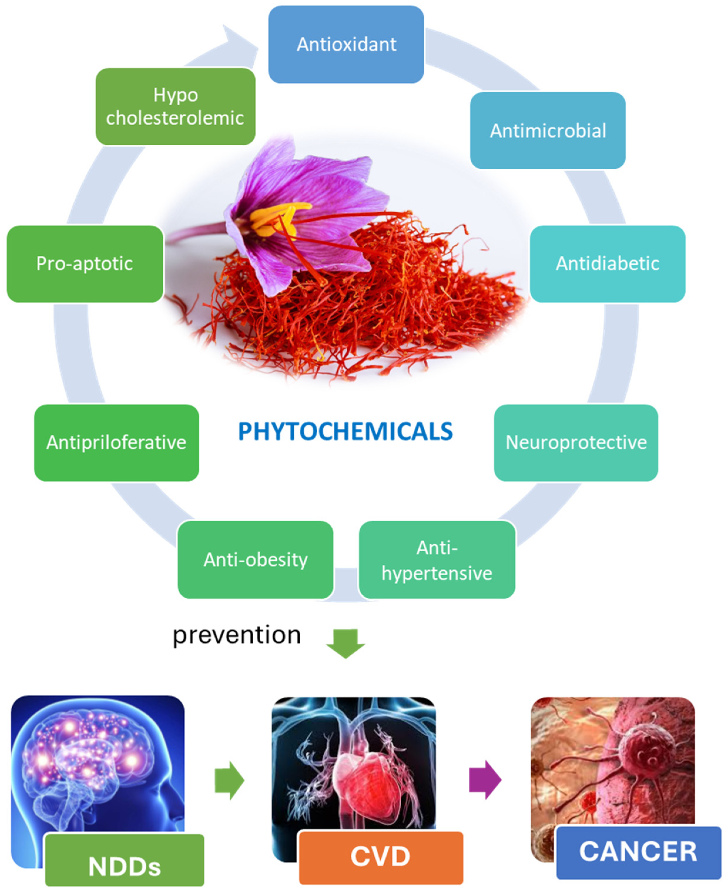 - Bej, E.; Volpe, A.R.; Cesare, P.; Cimini, A.; d’Angelo, M.; Castelli, V. Therapeutic Potential of Saffron in Brain Disorders: From Bench to Bedside. Phytother. Res. 2024, 38, 2482–2495. [Google Scholar] [CrossRef] [PubMed]