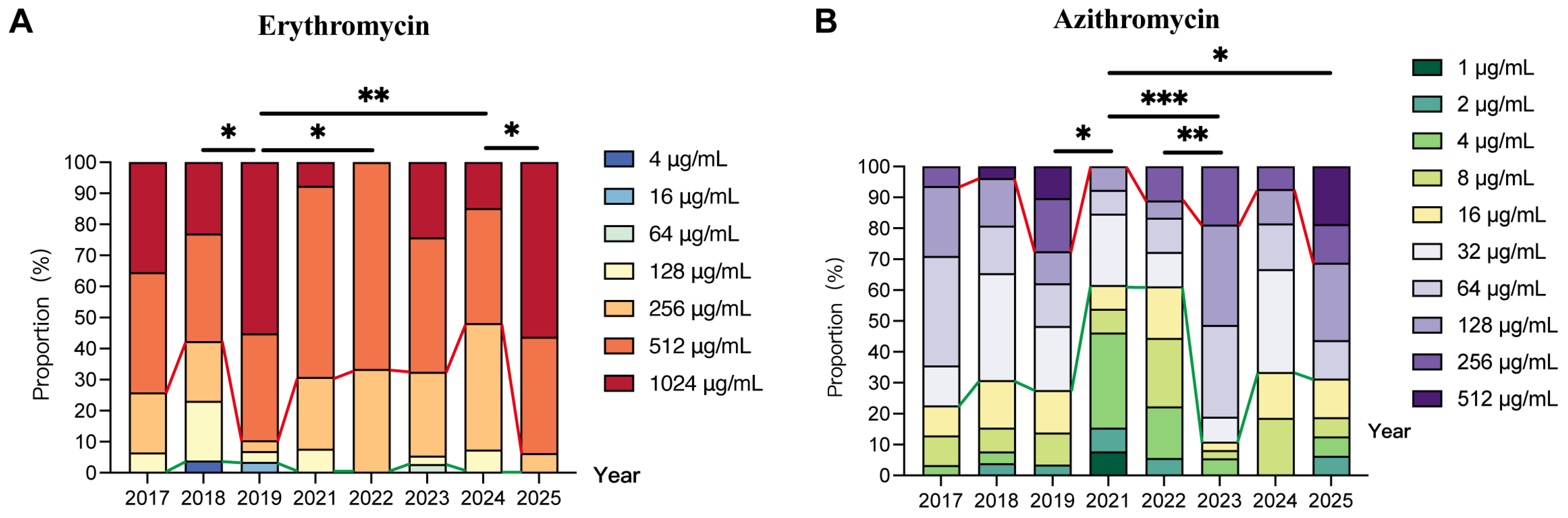 | Erythromycin | Low epidemic phase (2017–2018) | 57 | 4–1024 | 512 | 1024 | <0.001 |
