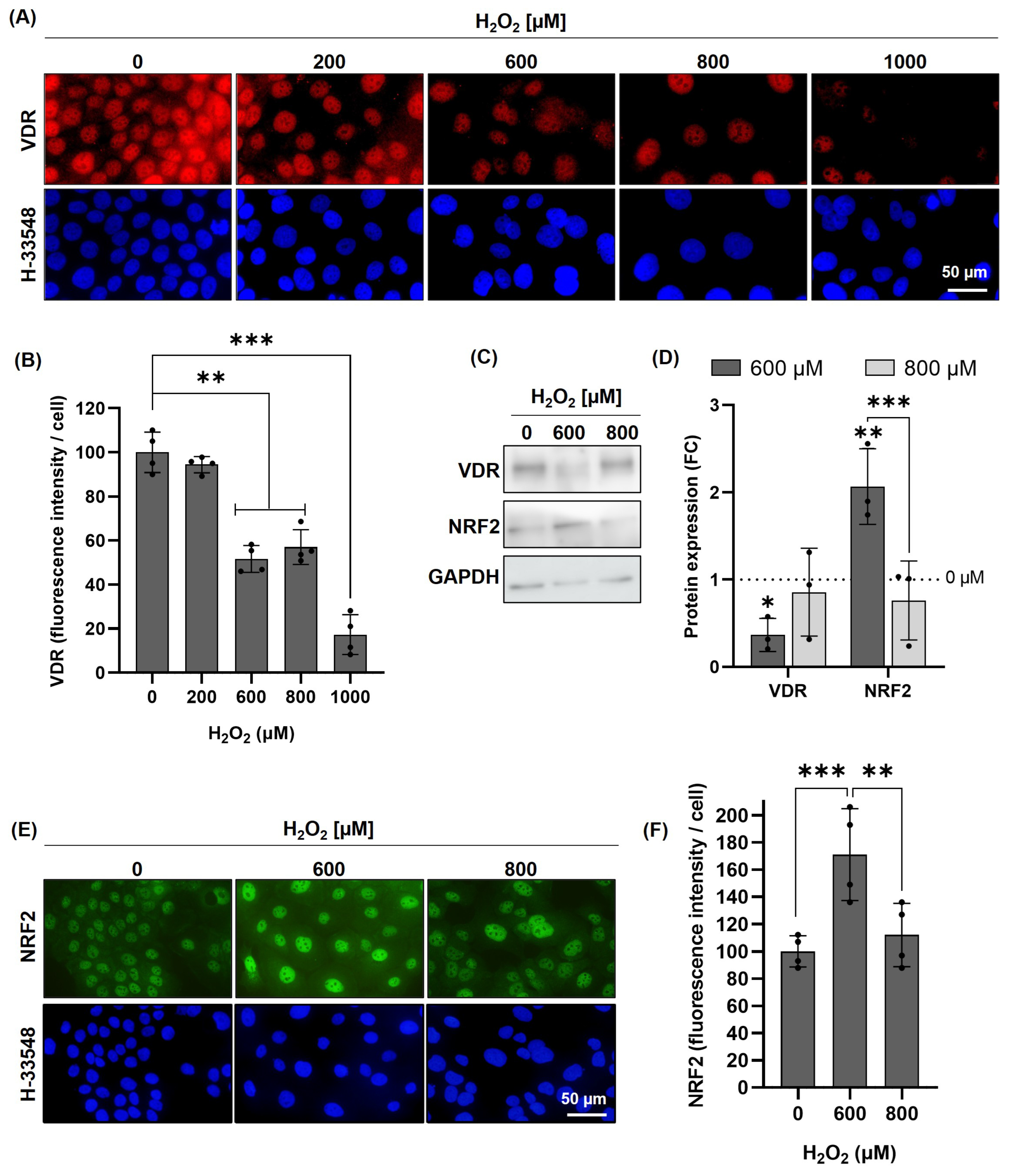 2.1. H2O2-Induced Oxidative Stress Reduces VDR in HaCaT Cells