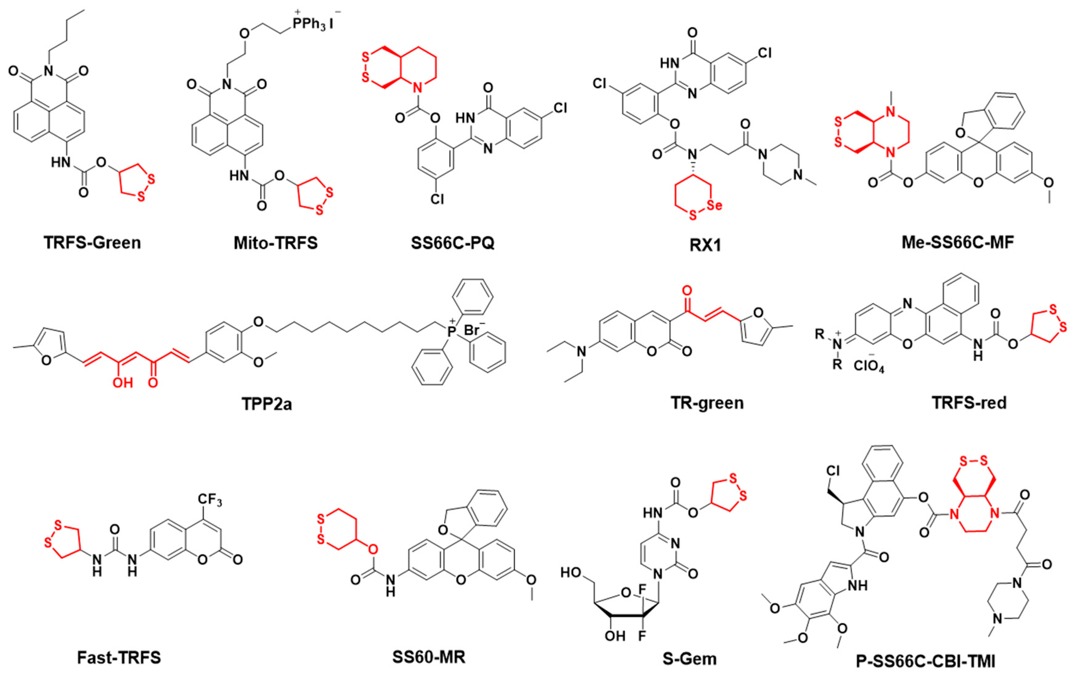 - Li, X.; Zhang, B.; Yan, C.; Li, J.; Wang, S.; Wei, X.; Jiang, X.; Zhou, P.; Fang, J. A fast and specific fluorescent probe for thioredoxin reductase that works via disulphide bond cleavage. Nat. Commun. 2019, 10, 2745. [Google Scholar] [CrossRef]