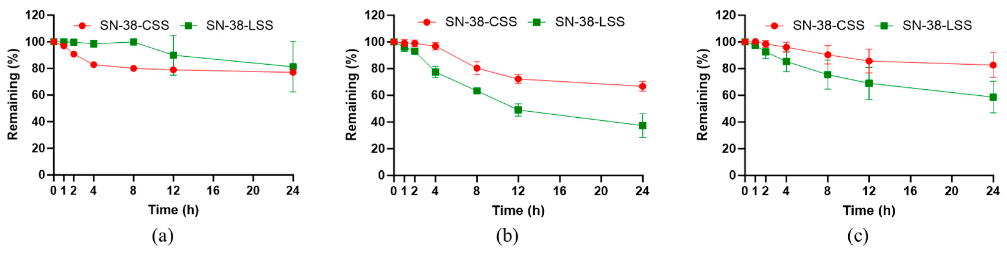 | SN-38-LSS | 4.58 ± 0.92 | 0.52 ± 0.19 | 0.24 ± 0.07 | 1.49 ± 0.55 | 2.77 ± 1.12 | 1.01 ± 0.12 |