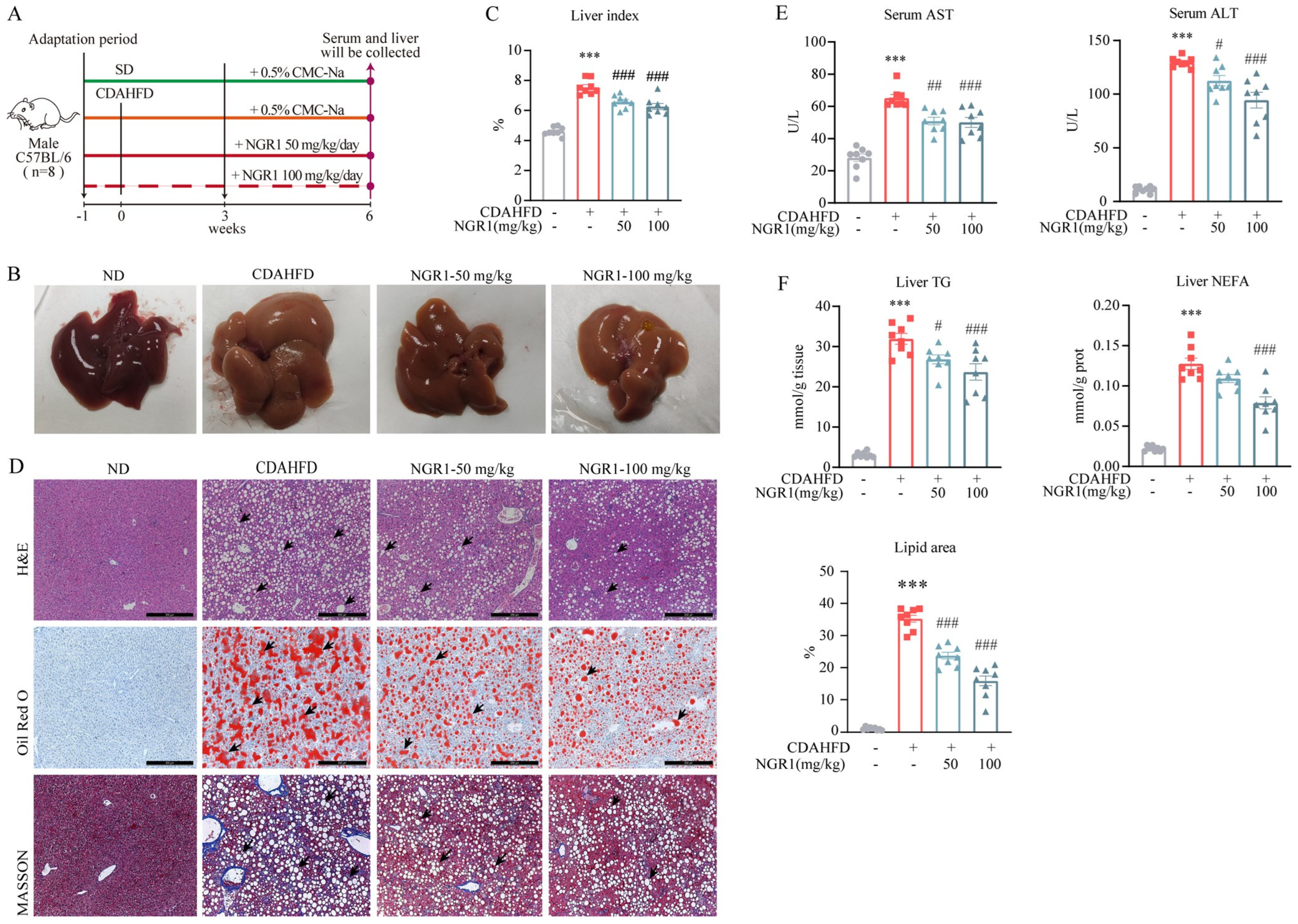 2.1. NGR1 Attenuates CDAHFD-Induced Hepatic Pathological Damage in Mice