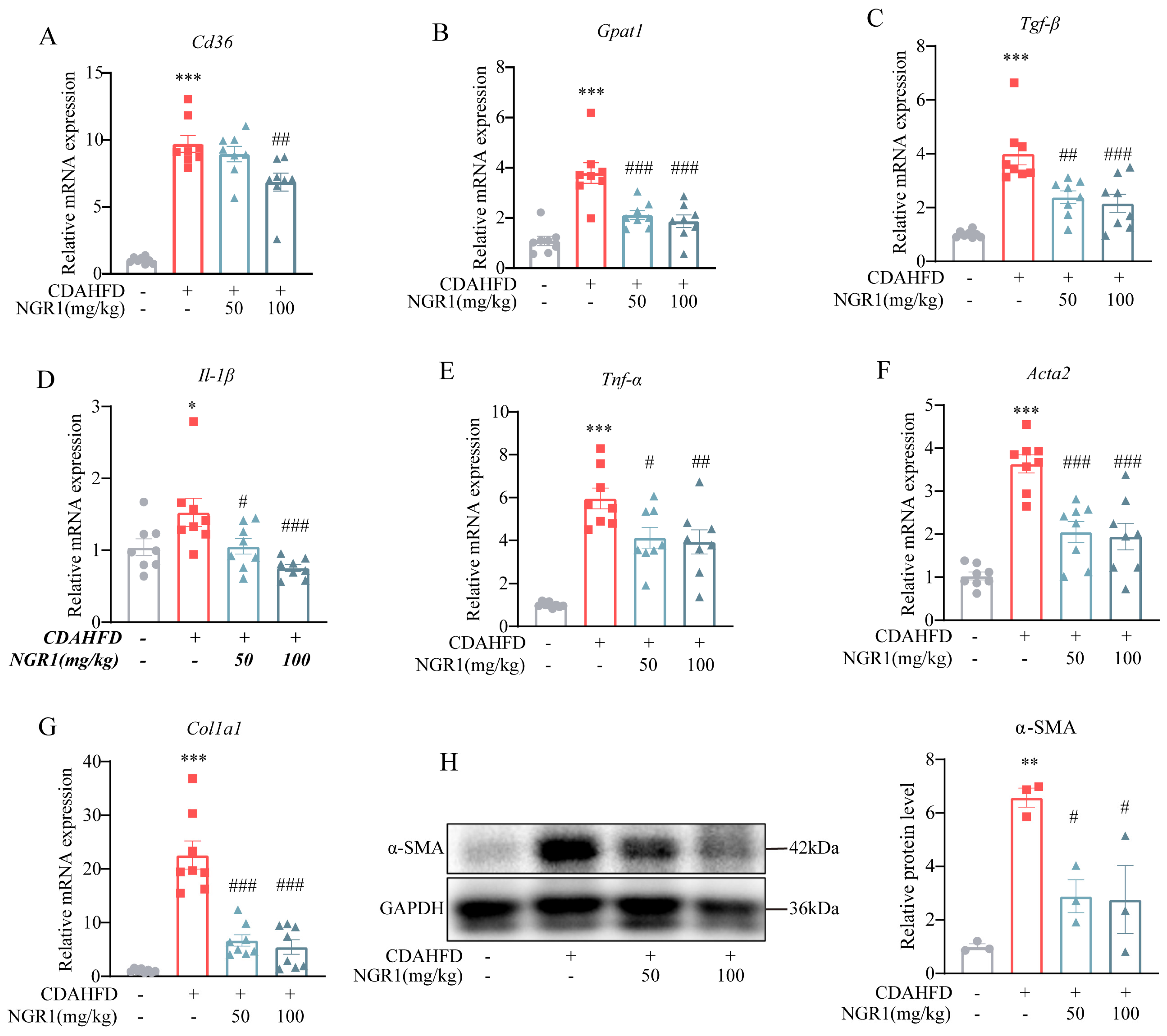 2.2. NGR1 Reduces Liver Lipid Synthesis, Inflammation, and Fibrosis in CDAHFD-Fed Mice