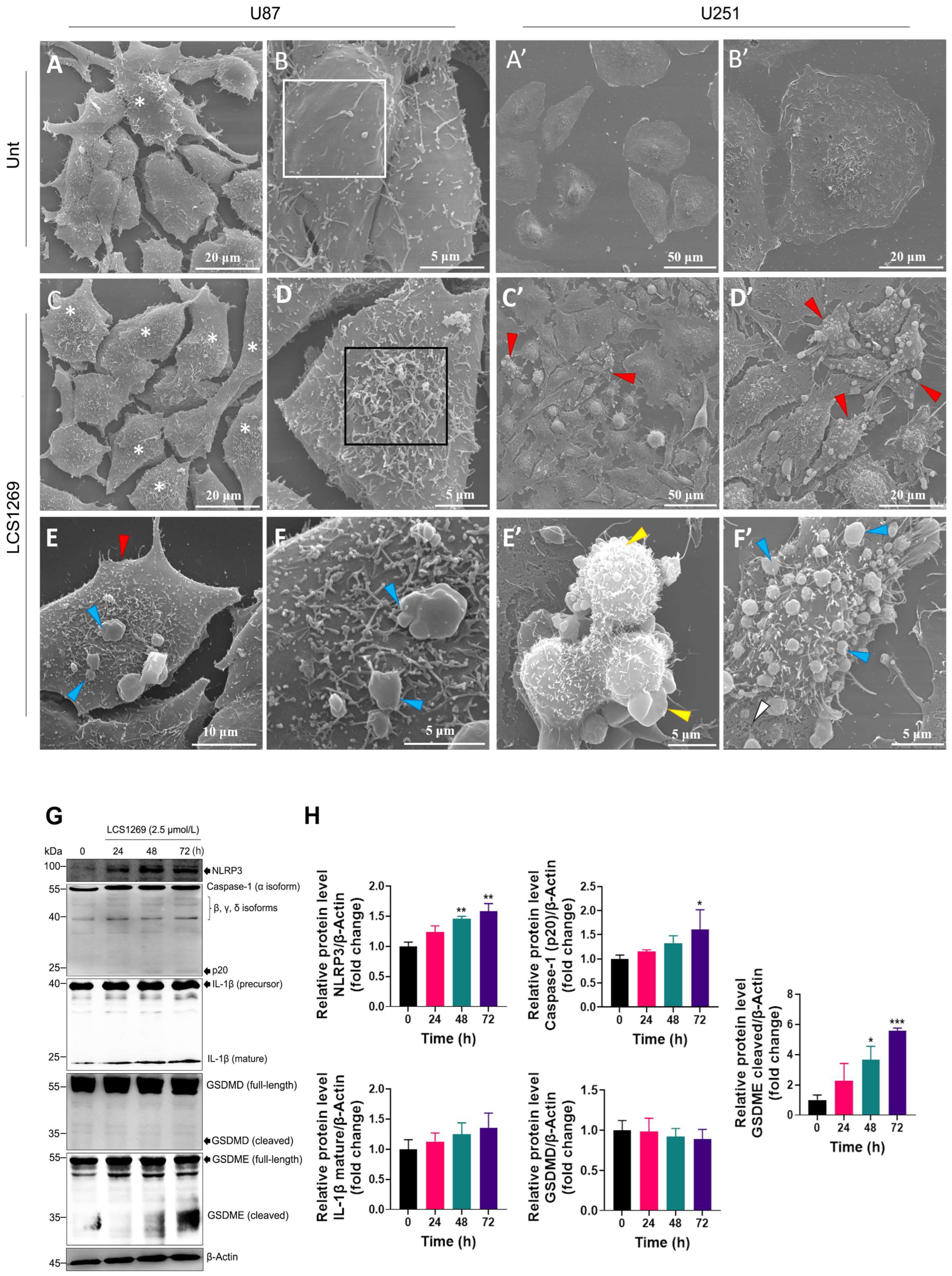 2.3. LCS1269 Is Able to Trigger Both Robust Pyroptosis and Marginal Pyroptosis-like Features in the GBM Cell Lines via a Caspase-3/GSDME Axis