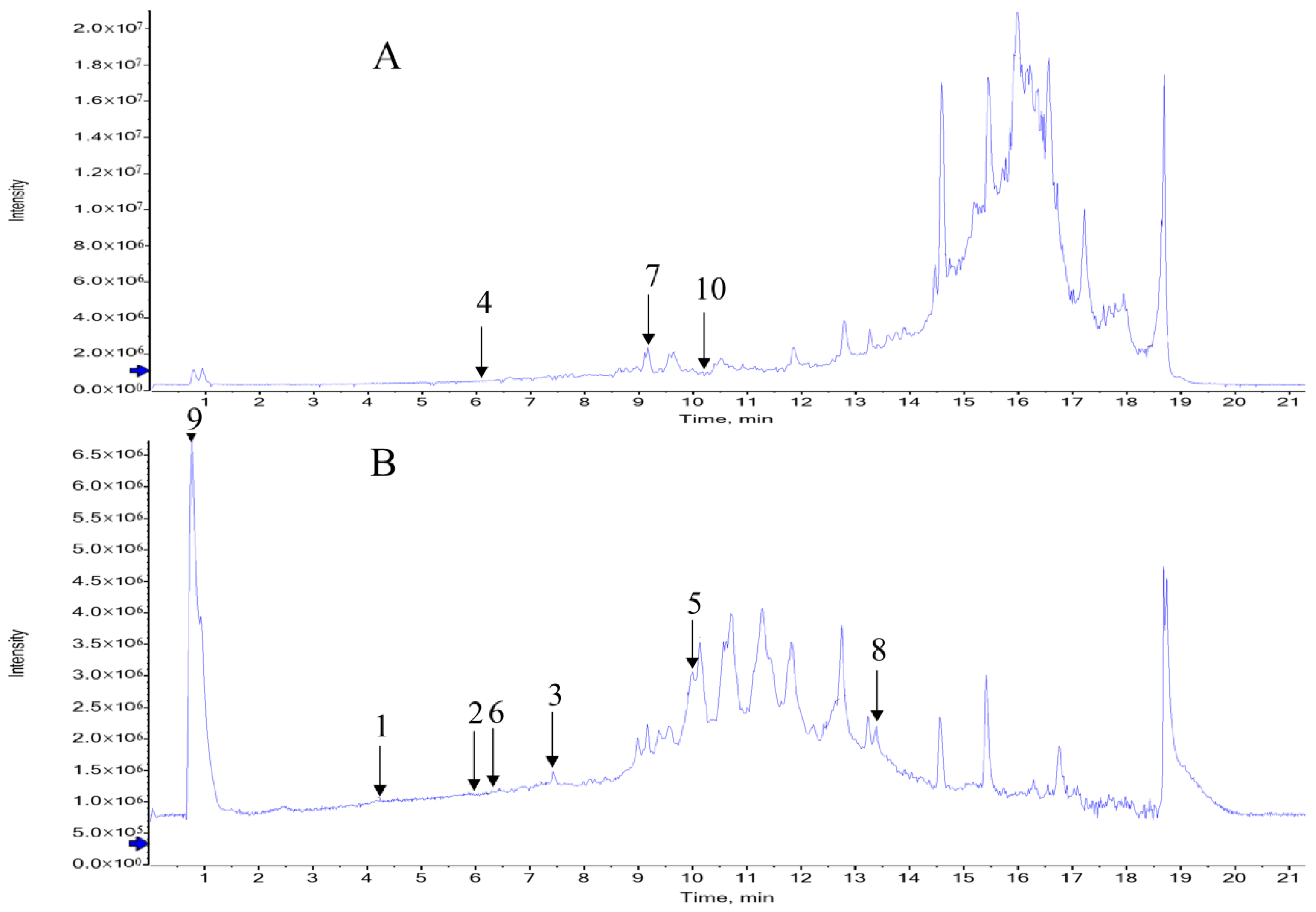 4.2.2. Identification of Rabbit BHD-CCSF Migration Components with UPLC-Q-TOF/MS