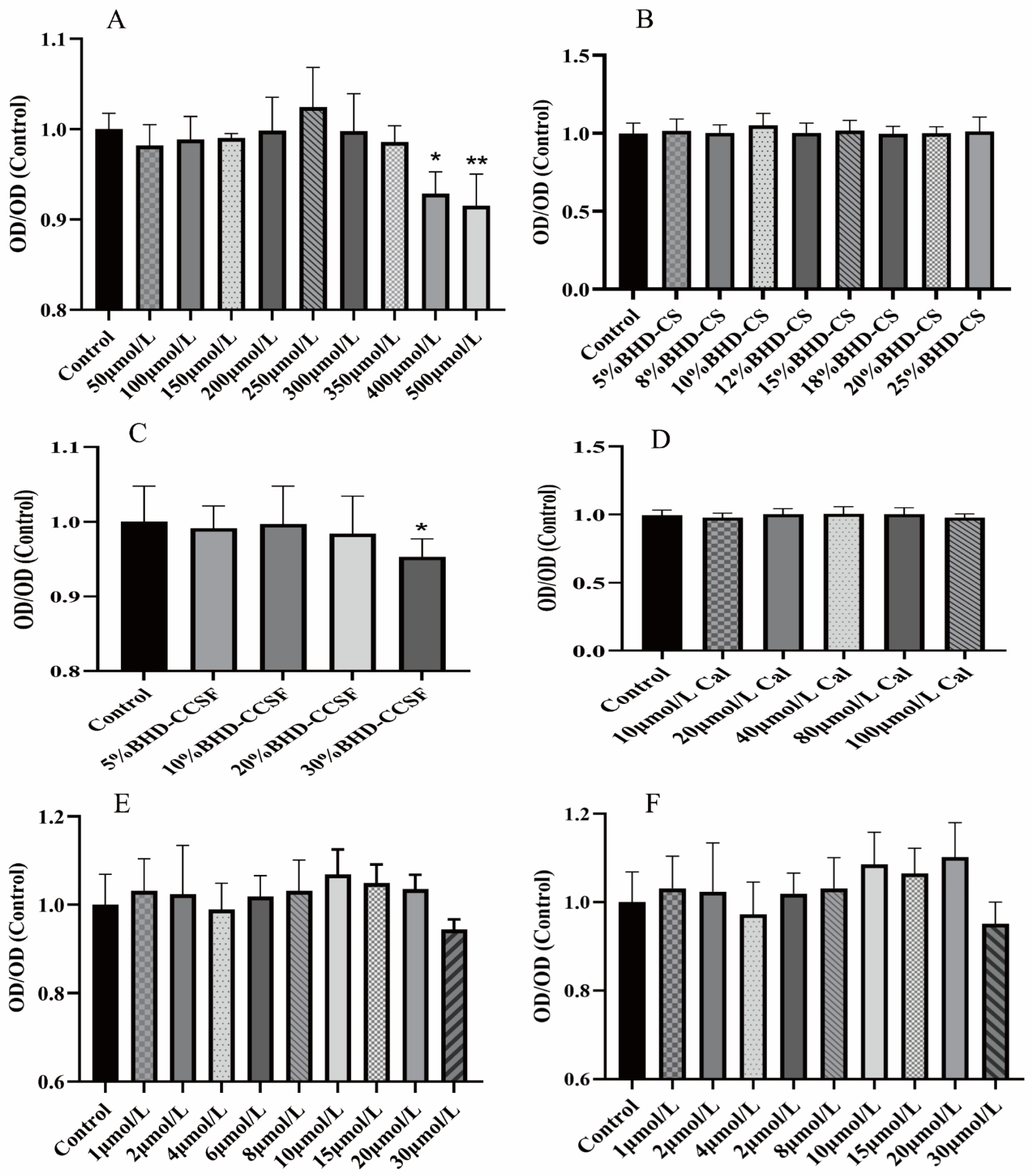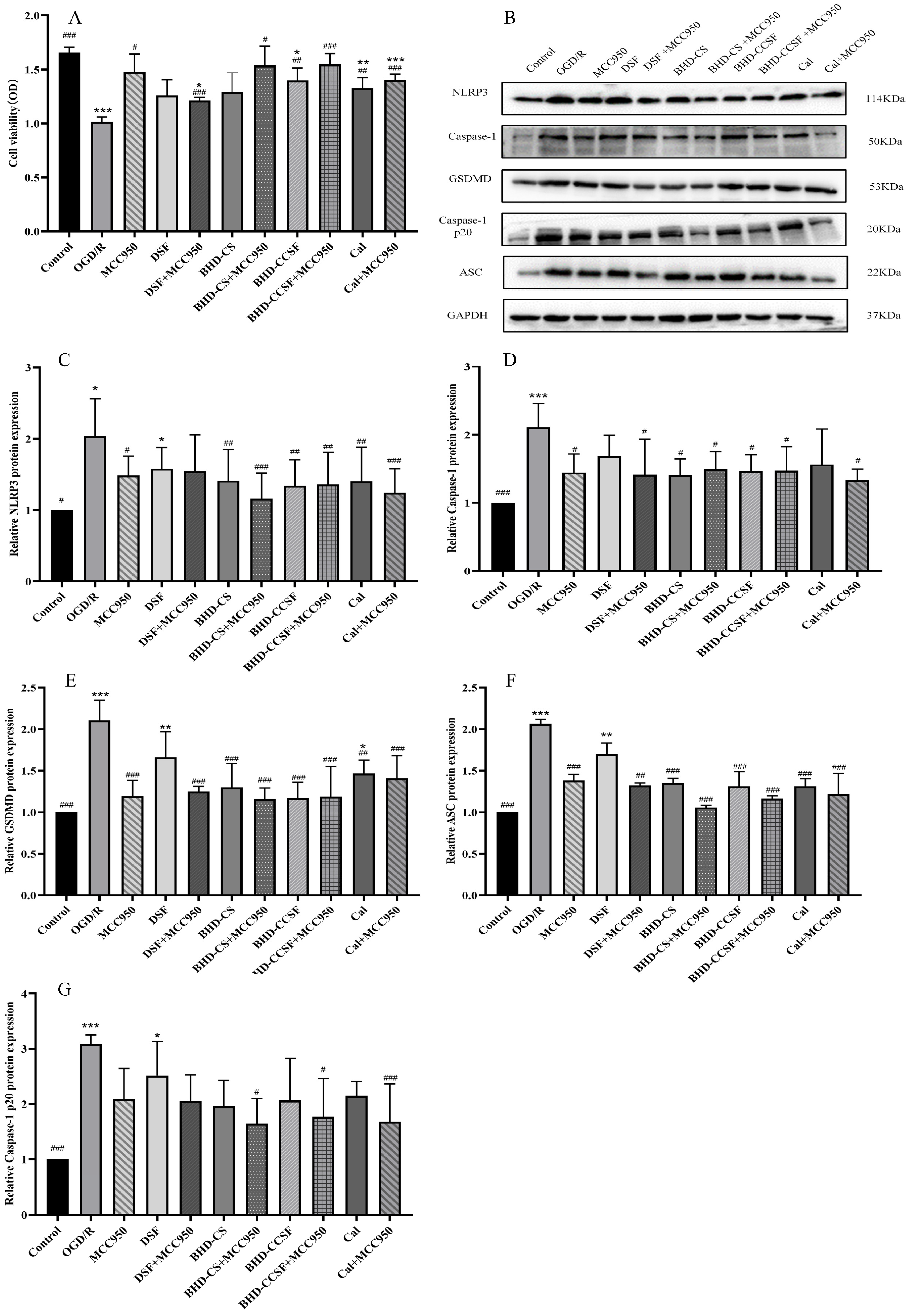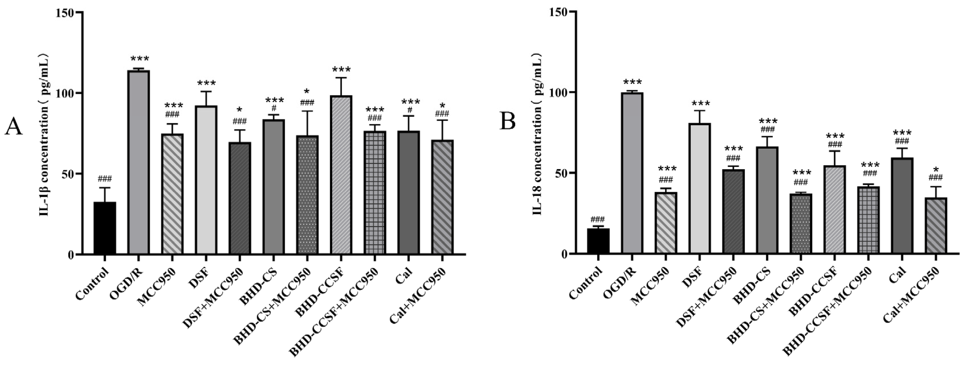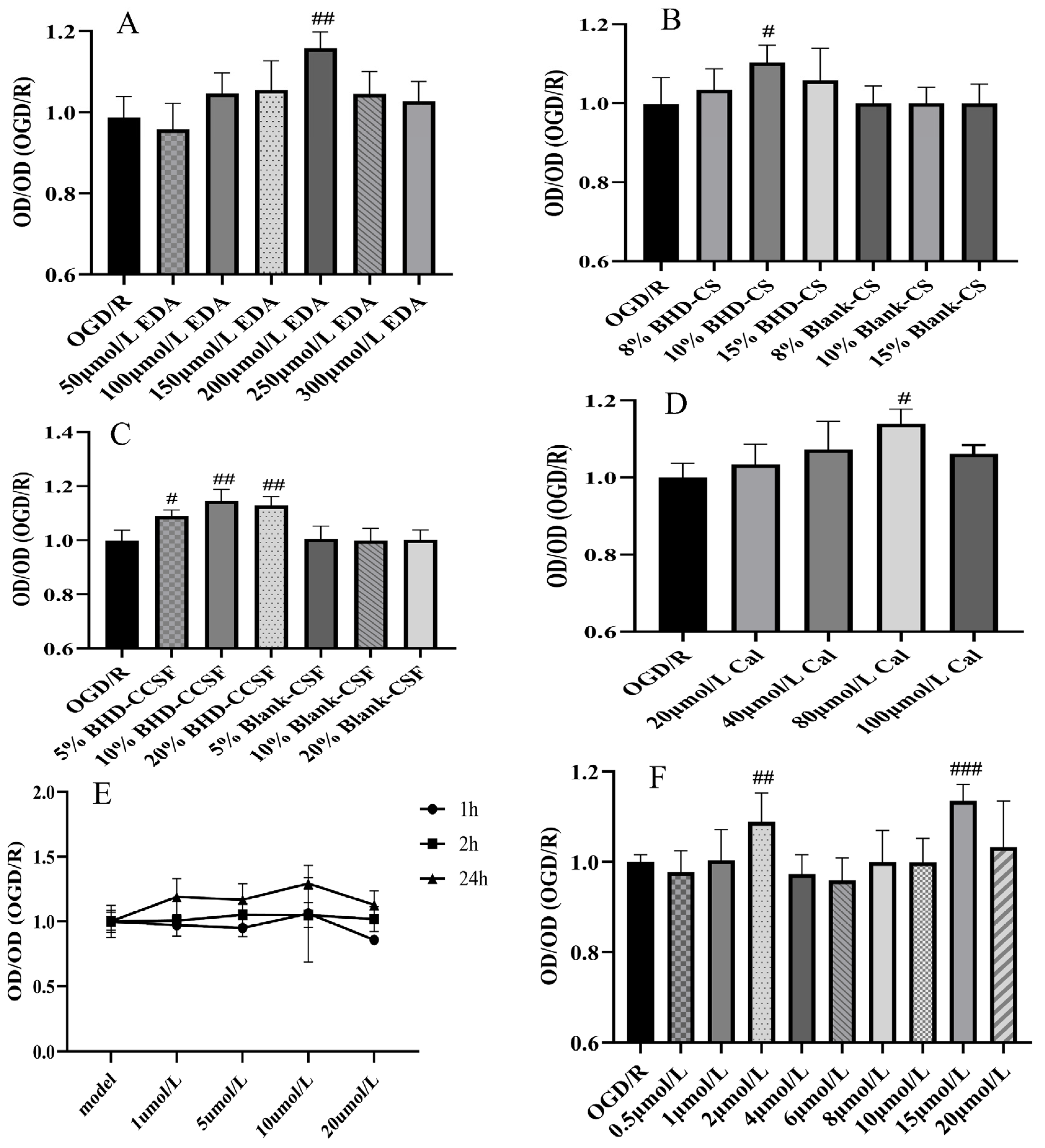 4.3.3. Screening of Effective Concentration of BHD-CCSF, BHD-CS, Edaravone (EDA), Cal, MCC950 and DSF in OGD/R Cells