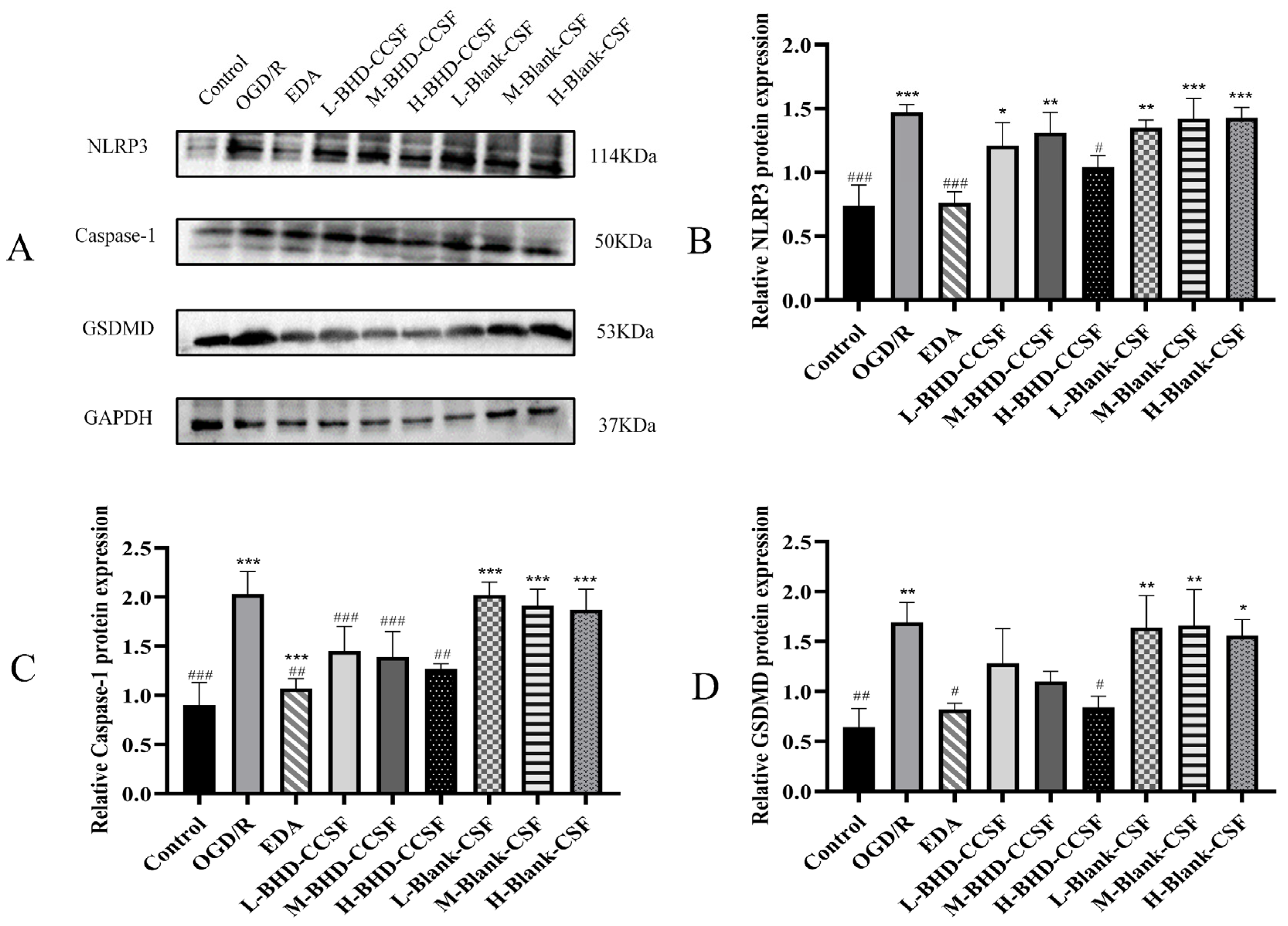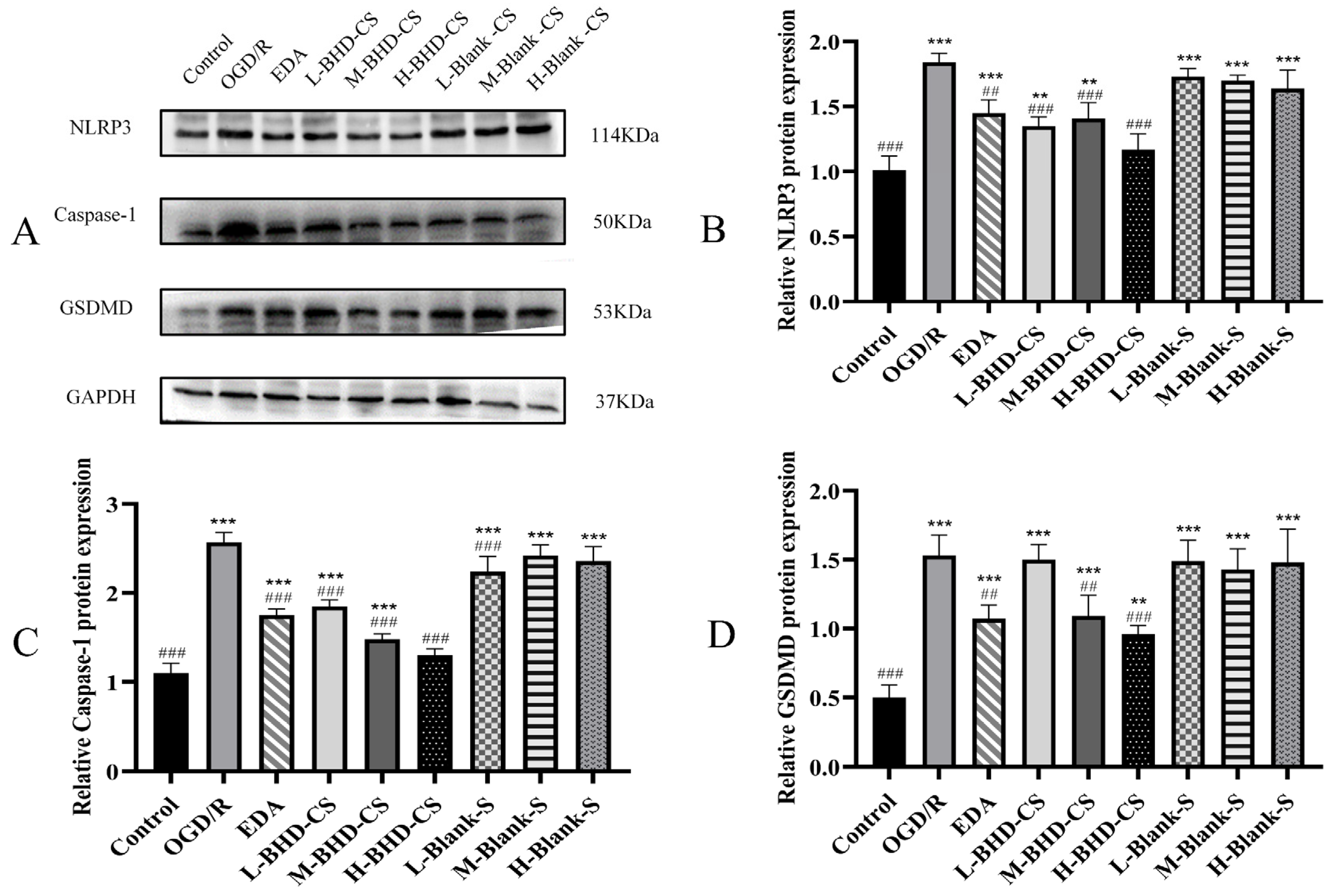 2.4. Effect of BHD-CS and BHD-CCSF on NLRP3, Caspase-1, GSDMD, Caspase-1 p20 and ASC Expression Levels in OGD/R HT22 Cell