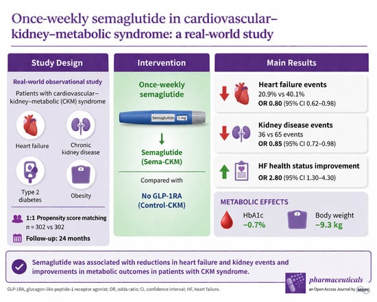 Chicago/Turabian StyleTrenas-Calero, Alicia, Nuria Prieto-Laín, Ana I. Gómez-Hernández, Miguel A. Pérez-Velasco, María-Rosa Bernal-López, María-Dolores López-Carmona, María-Dolores García de Lucas, Ricardo Gómez-Huelgas, and Luis M. Pérez-Belmonte. 2026. "Once-Weekly Semaglutide in Patients with Cardiovascular-Kidney-Metabolic Syndrome: A Real-World Study" Pharmaceuticals 19, no. 4: 583. https://doi.org/10.3390/ph19040583