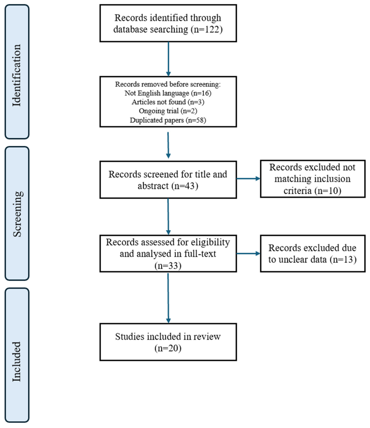 Overall, we identified 122 records through database searching. As a first step, we excluded 16 articles in a non-English language, 3 records whose related articles were not available, 2 articles concerning ongoing trials, and 58 duplicated papers. As a second step, we eliminated 10 records by evaluating only title and abstract because they did not match the inclusion criteria above-mentioned. Of the remaining 33 studies, we excluded 13 through a further discussion among the authors on the reliability of the data. These studies—2 clinical and 11 preclinical—were excluded (by LDS, SF and LM) mainly due to the presence of confounding variables and selection bias. Thus, 20 selected articles were included in the review. The detailed selection of the literature is shown in