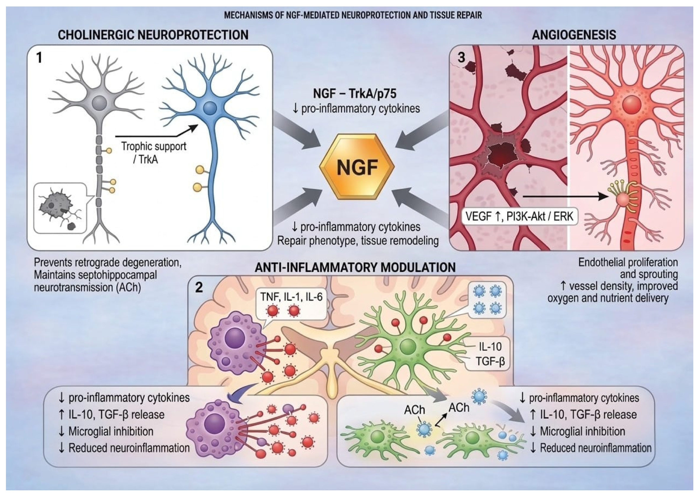 In this context, neurotrophic factors have gained attention as potential modulators of brain repair. Nerve growth factor (NGF) is a central regulator of neuronal survival, differentiation, and synaptic plasticity [