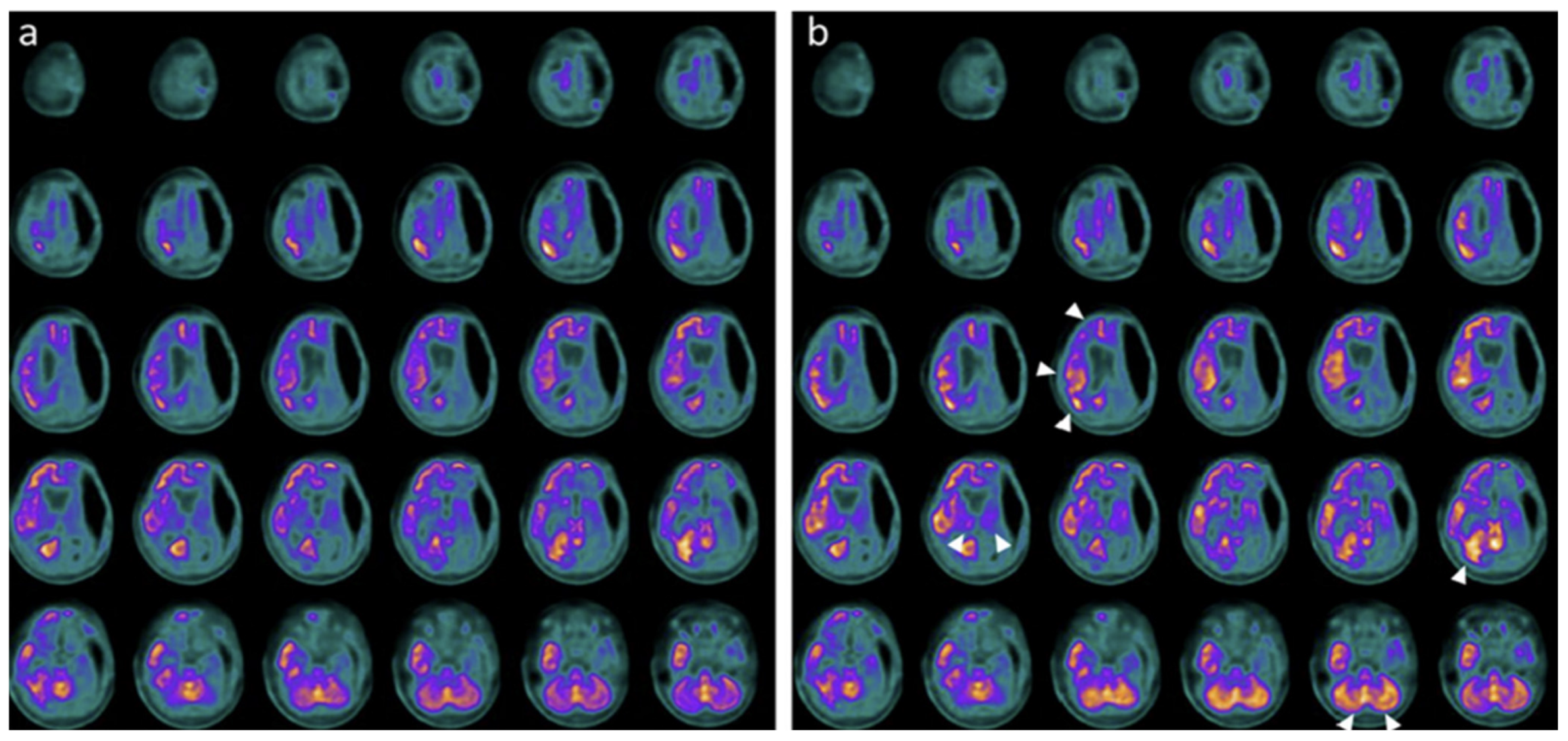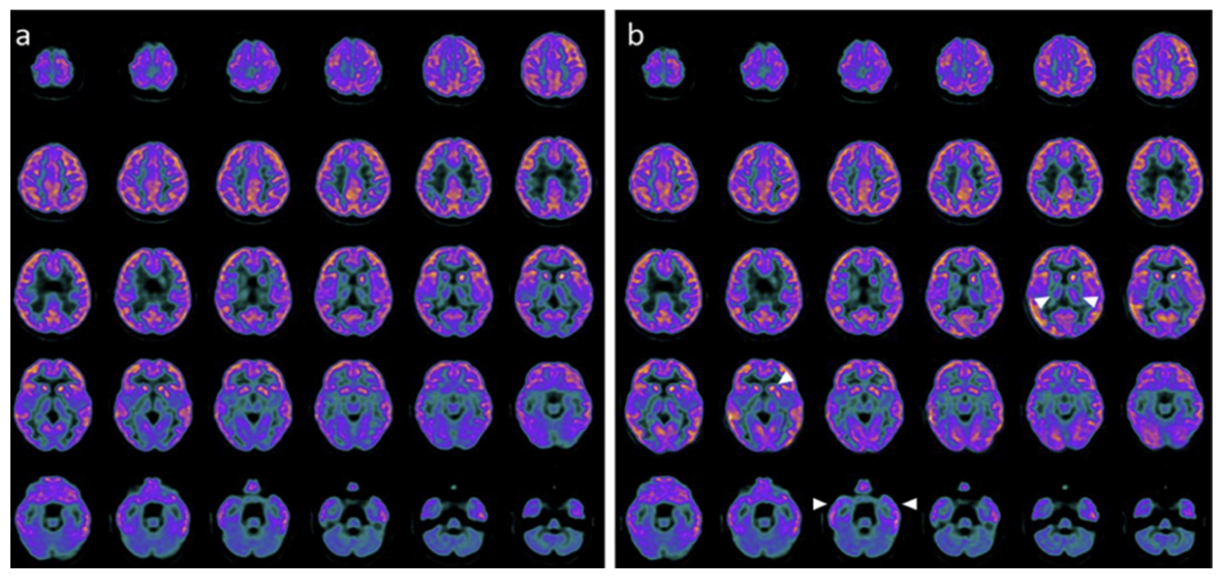 31]. Baseline PET and SPECT revealed widespread reductions in cerebral metabolism and perfusion, particularly involving the thalami, brainstem, striatum, cerebellum, and mesial temporal regions, with variable cortical involvement across patients [
