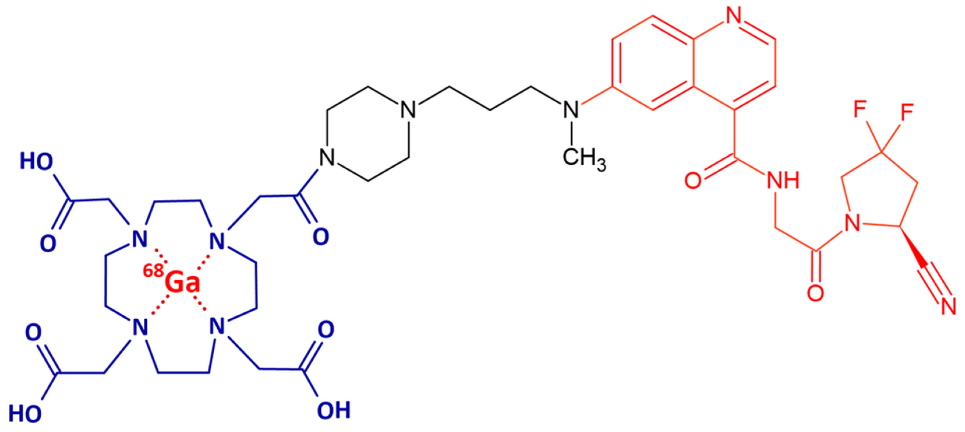 - Lindner, T.; Loktev, A.; Altmann, A.; Giesel, F.; Kratochwil, C.; Debus, J.; Jäger, D.; Mier, W.; Haberkorn, U. Development of Quinoline-Based Theranostic Ligands for the Targeting of Fibroblast Activation Protein. J. Nucl. Med. 2018, 59, 1415–1422. [Google Scholar] [CrossRef]