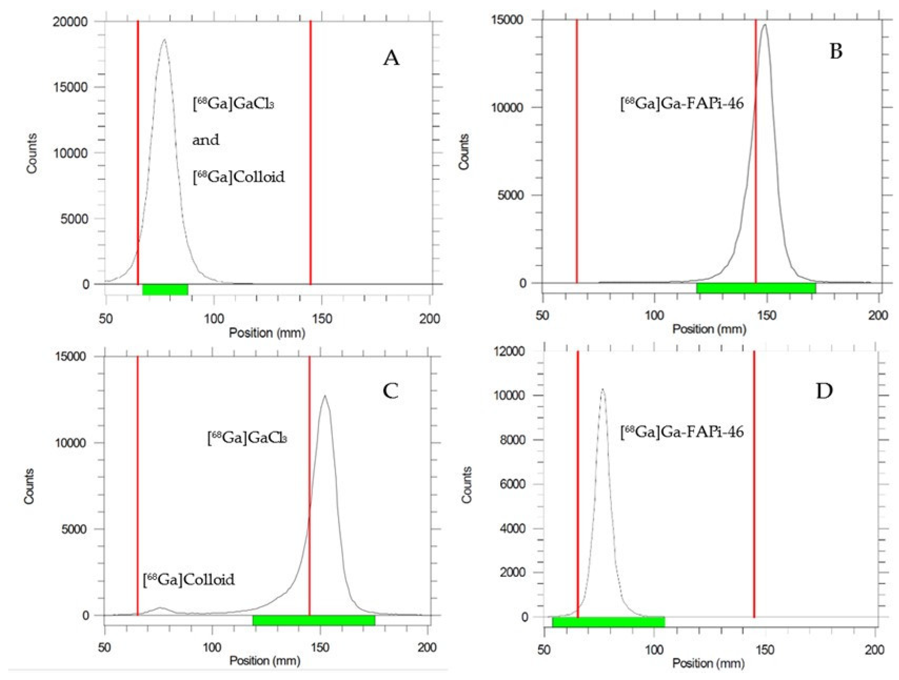 - Cafaro, A.; Cuni, C.; Boschi, S.; Landi, E.; Foschi, G.; Monti, M.; Caroli, P.; Matteucci, F.; Masini, C.; Di Iorio, V. Production and Quality Control of [68Ga]Ga-FAPI-46: Development of an Investigational Medicinal Product Dossier for a Bicentric Clinical Trial. Pharmaceuticals 2025, 18, 1475. [Google Scholar] [CrossRef]