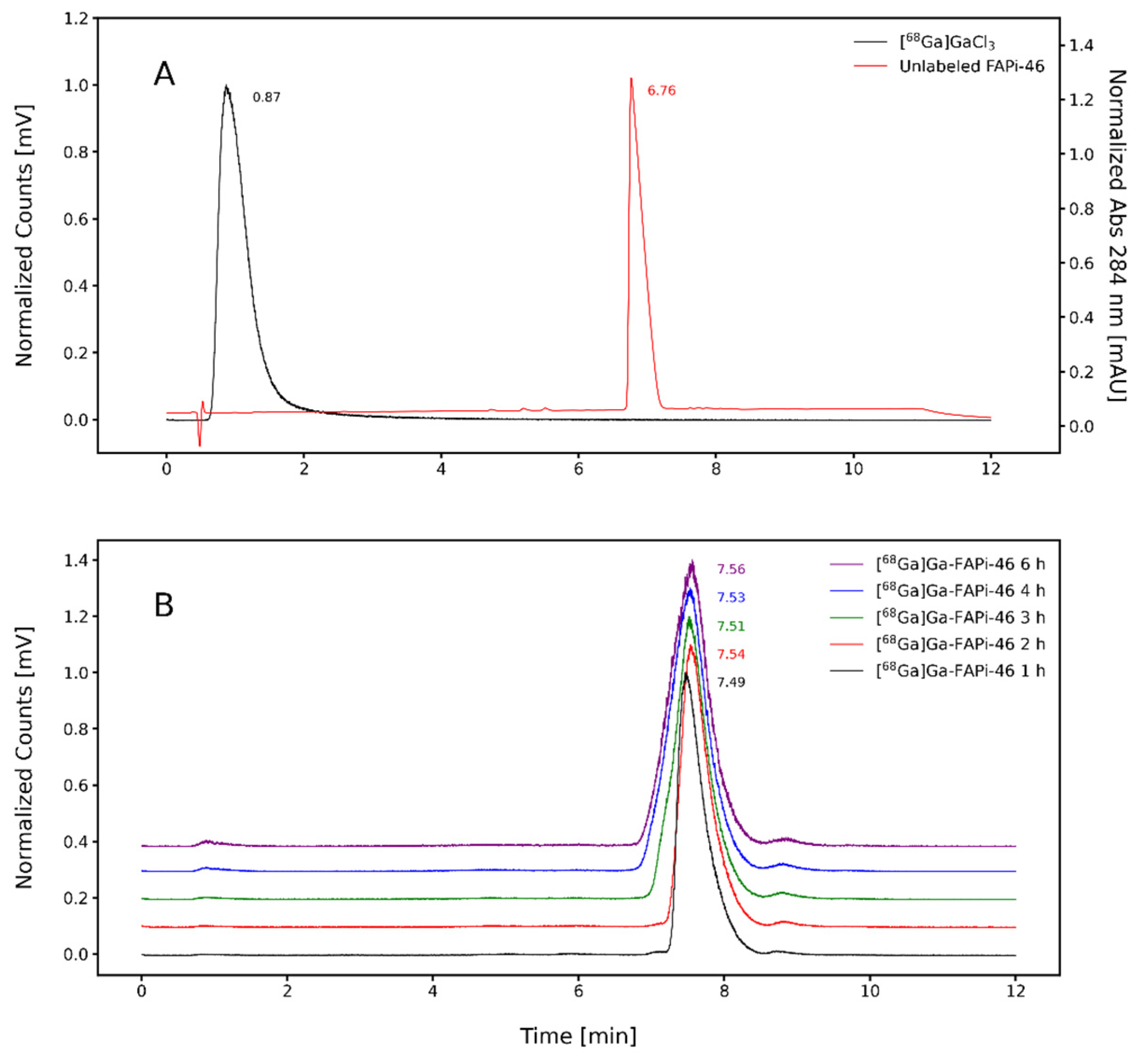 2.2. Radiochemical Stability of [68Ga]Ga-FAPi-46 in Saline and Human Serum