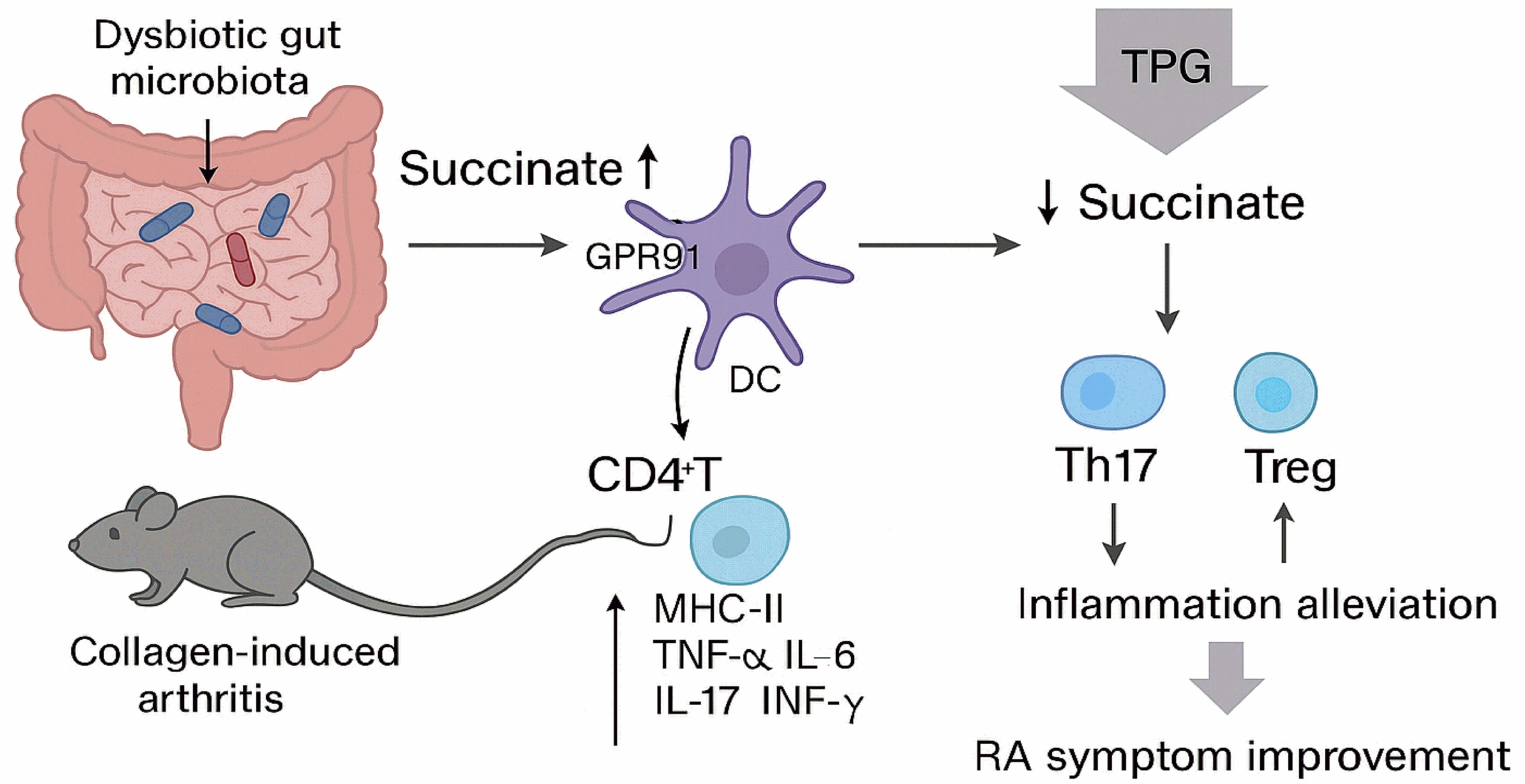 Based on the background described above, this study employs animal and cellular models to investigate the role of the receptor GPR91 in intestinal DCs in RA pathogenesis and to elucidate the mechanisms of underlying the therapeutic effect of TPGs on RA.