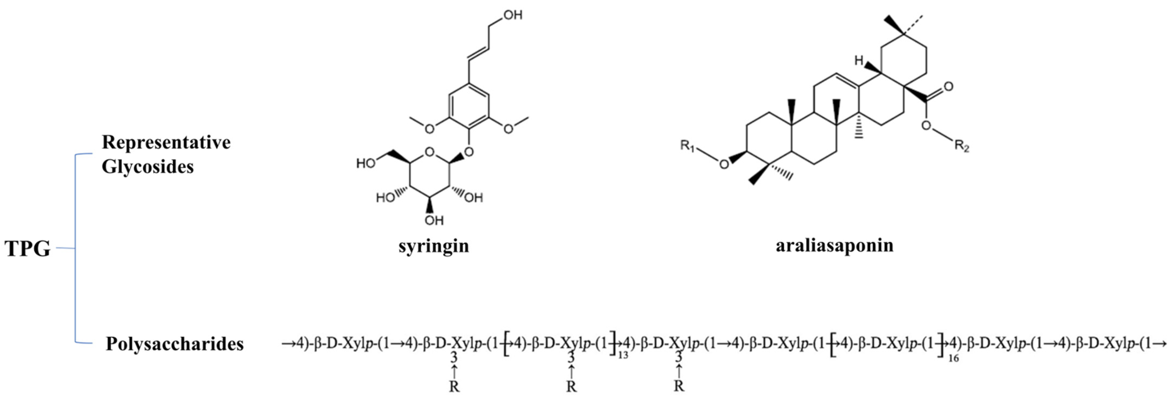 TPGs were prepared as previously described [10]. Briefly, A. echinocaulis roots (voucher No. lyz09; Wenzhou, China, June 2021) were processed to isolate glycosides and polysaccharides. Glycosides were extracted from root bark with 85% ethanol and sequentially partitioned with petroleum ether, ethyl acetate, and n-butanol. The n-butanol fraction was purified with D101 macroporous resin (90% ethanol elution, 18:1 height/diameter ratio) and Sephadex LH-20 column chromatography (50% methanol), achieving a purity of 96.9%. Polysaccharides were isolated from the ethanol-extracted residue through aqueous extraction (10:1 water-to-material ratio), ethanol precipitation (4:1 ethanol-to-supernatant ratio), decolorization (with 1% activated carbon), deproteinization (Sevag method), and lyophilization, yielding a final purity of 96.0%. The purified glycosides and polysaccharides were combined to yield TPGs for subsequent use. (The detailed preparation workflow is illustrated in Supplementary Figure S1). Previous studies have demonstrated that TPGs include characteristic glycosides including syringin, araliasaponins IV, VI, VII, and XVI, as well as a polysaccharide identified as 4-O-methylglucuronoxylan (molecular weight: 16 kDa) composed of xylan and 4-O-methylglucuronic acid [43,44,45].