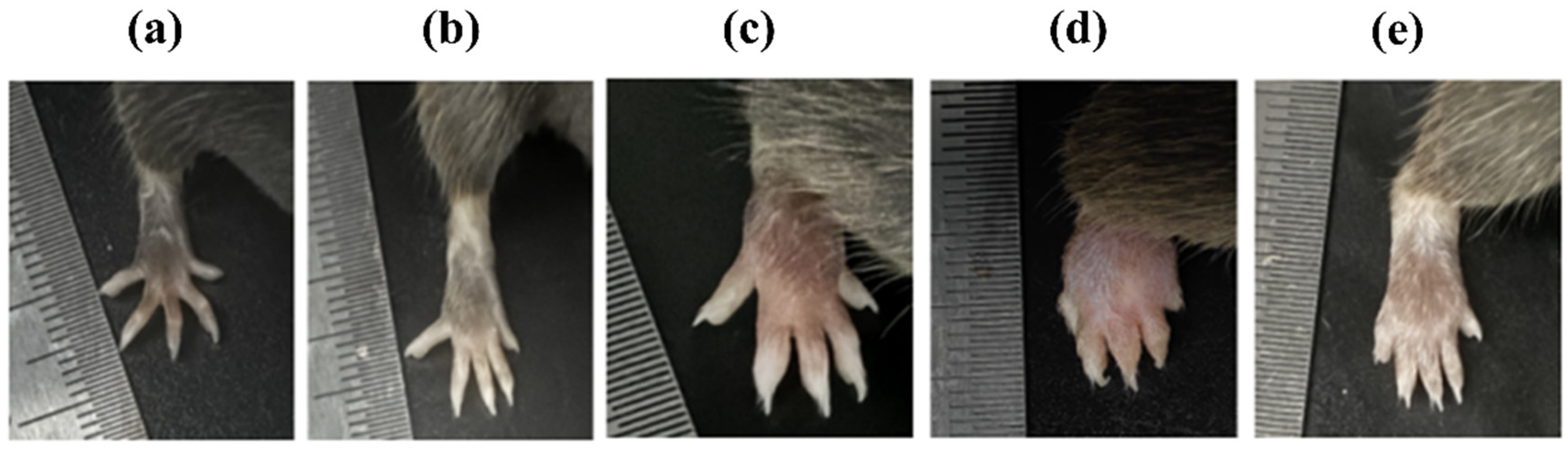 Figure 2. Photographs of the paws of mice from the different groups ((a) NG; (b) NG + succinate; (c) MG; (d) MG + succinate; (e) MG + TPGs). Notes: NG, normal control group; MG, model control group; TPGs, total polysaccharide and glycoside treatment group.