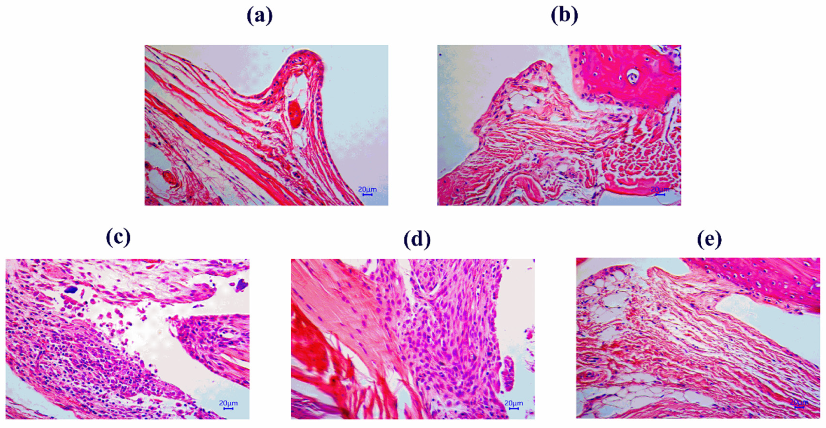 Figure 3. Effects of TPGs and succinate on the morphology of the ankle joint synovium in mice. ((a) NG; (b) NG + succinate; (c) MG; (d) MG + succinate; (e) MG + TPGs). Notes: NG, normal control group; MG, model control group; TPGs, total polysaccharide and glycoside treatment group.