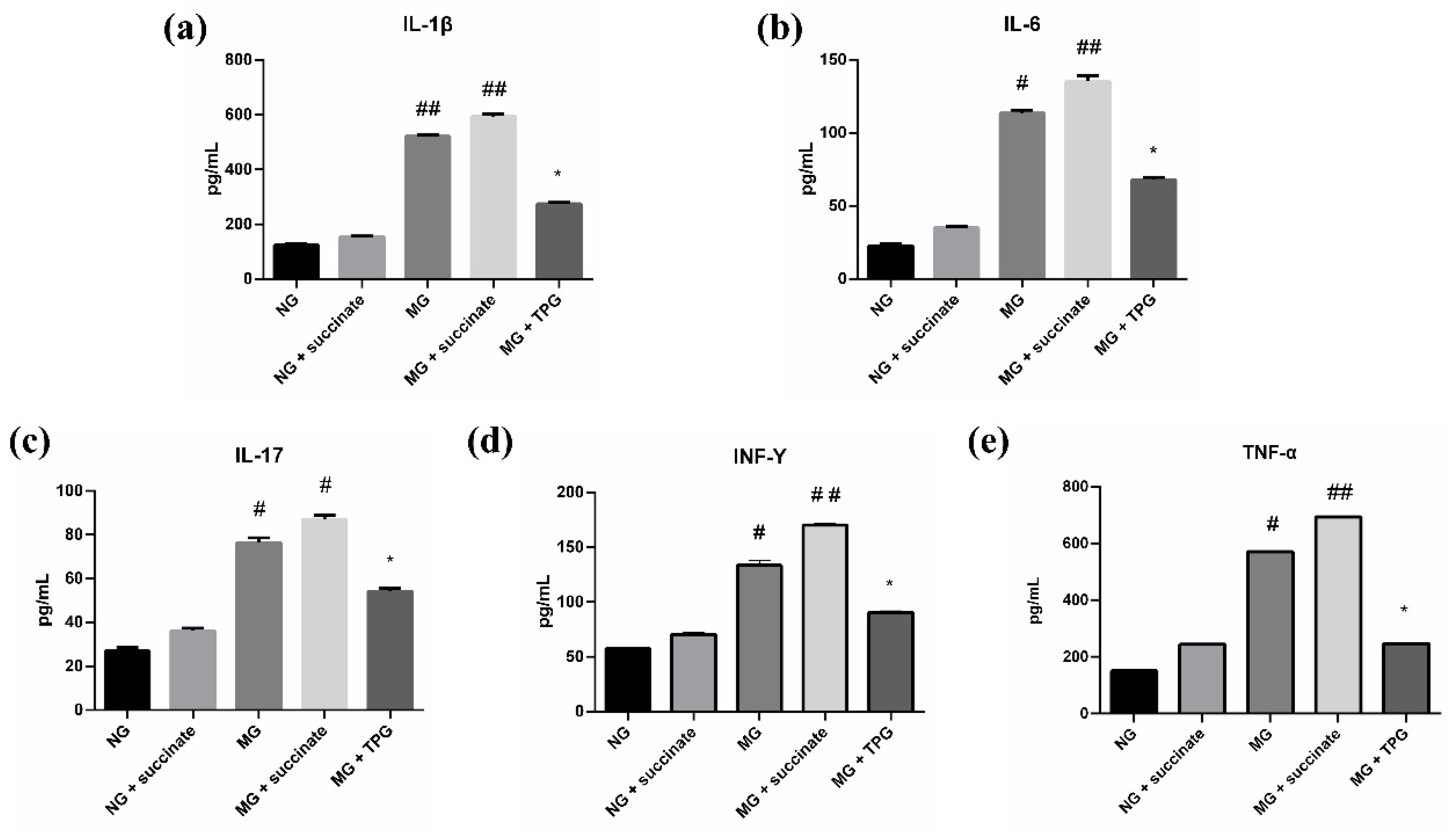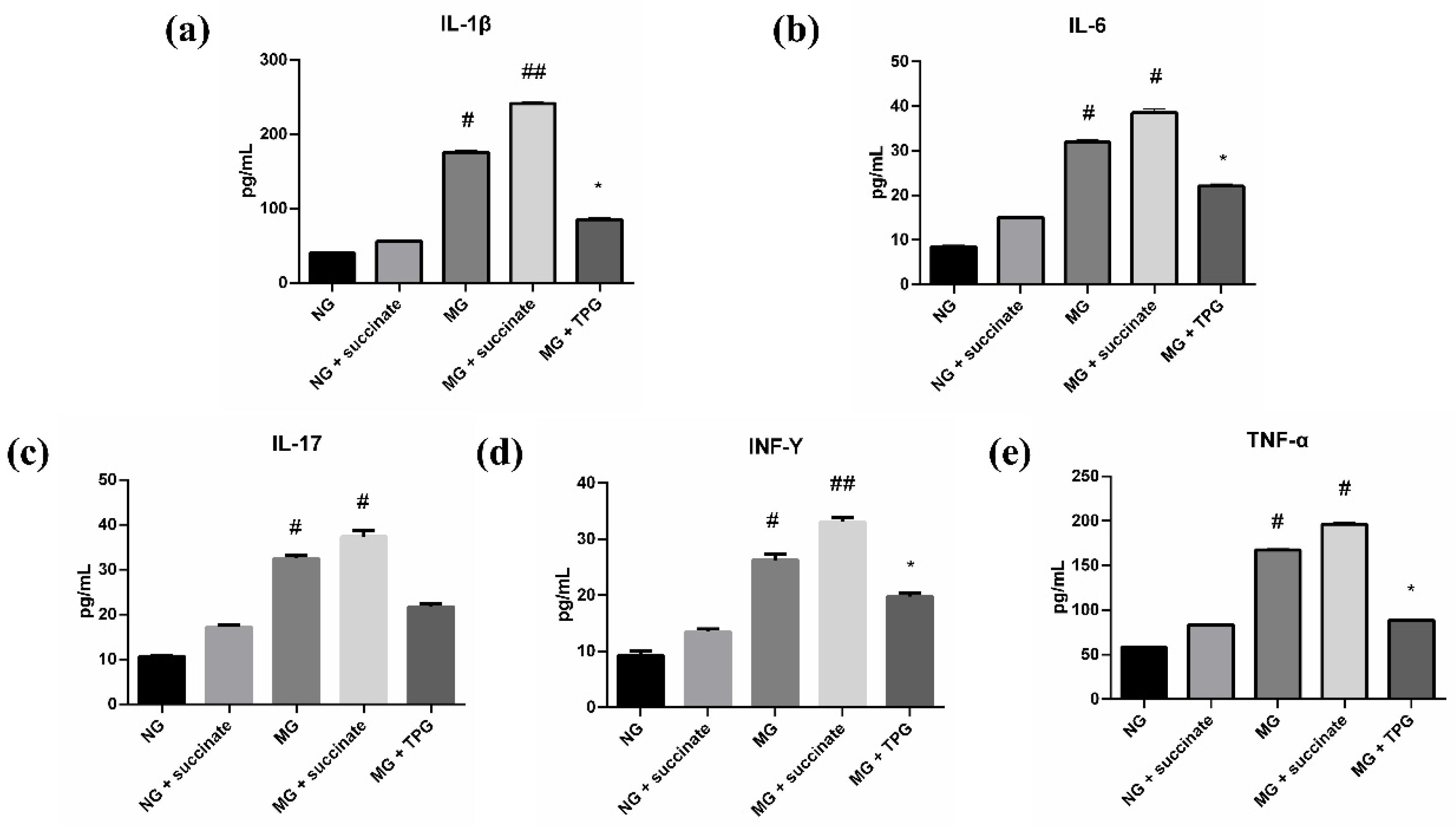 Figure 4. Effects of succinate and TPGs on the serum levels of inflammatory cytokines in the different groups of animals ((a) IL-1β; (b) IL-6; (c) IL-17; (d) INF-γ; (e) TNF-α). Compared with the NG, ## p < 0.01, # p < 0.05; compared with the MG, * p < 0.05. n = 6. Notes: NG, normal control group; MG, model control group; TPGs, total polysaccharide and glycoside treatment group.
