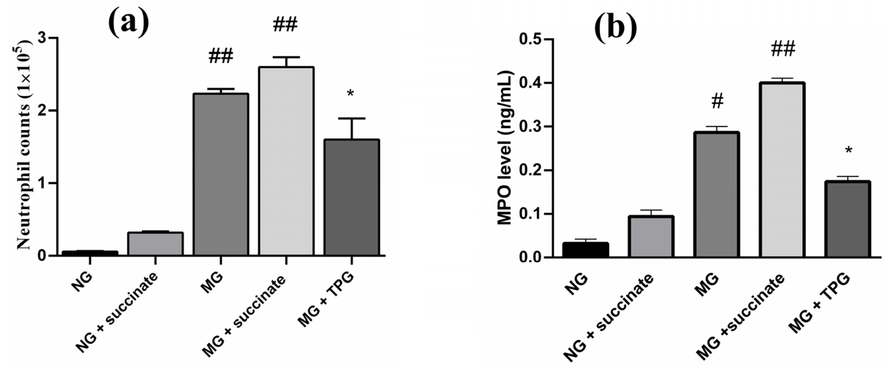 Figure 6. Effects of succinate and TPGs on neutrophil counts and MPO levels in the synovial fluid. (a) Neutrophil counts in the synovial fluid (×105 cells). (b) MPO levels measured by ELISA. Compared with the NG, ## p < 0.01, # p < 0.05; compared with the MG, * p < 0.05. n = 6. Notes: NG, normal control group; MG, model control group; TPGs, total polysaccharide and glycoside treatment group.