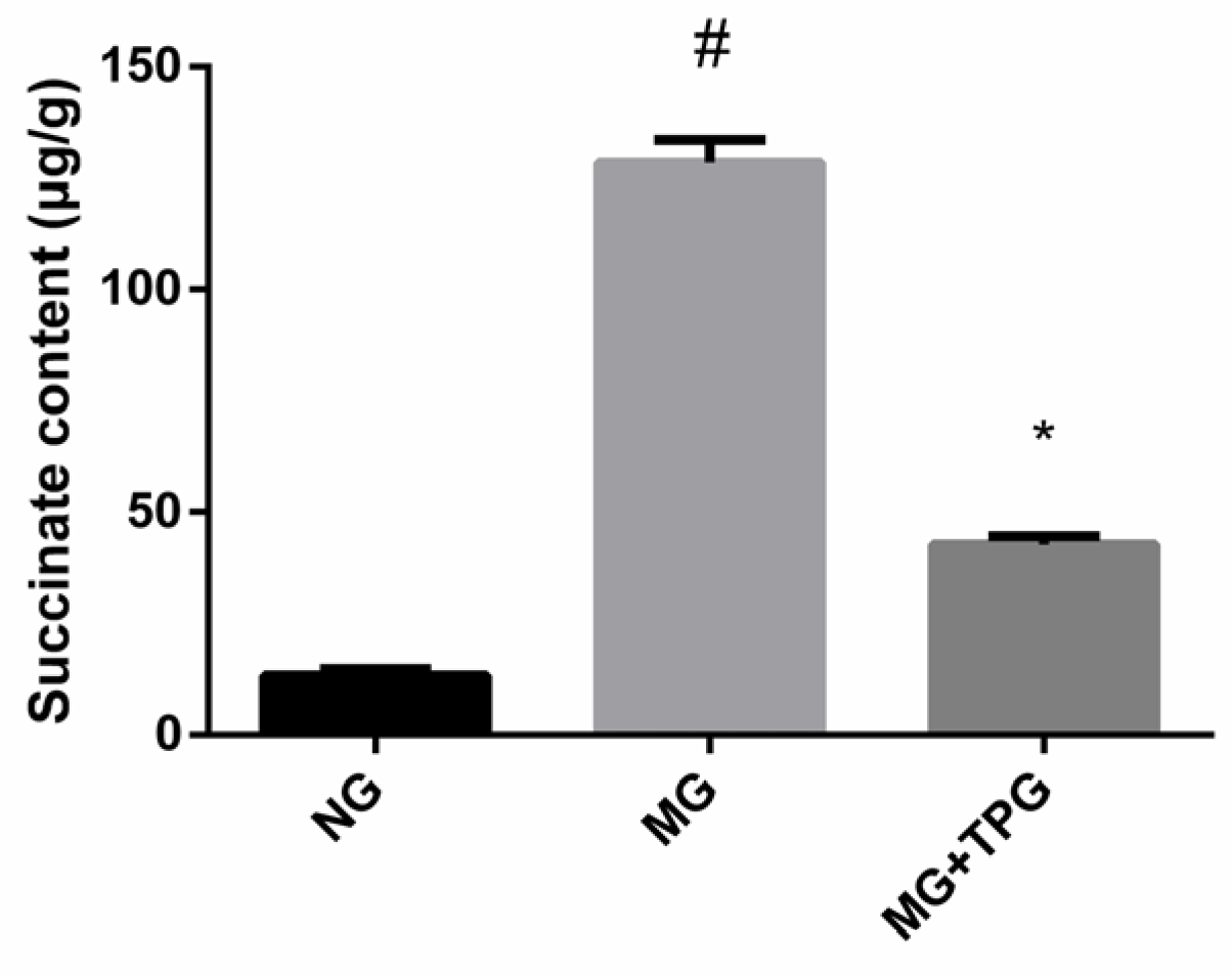 The above experiments demonstrated the proinflammatory effects of succinate and the anti-inflammatory effects of TPGs. Therefore, we next measured the levels of succinate in the intestinal tissues from the NG, MG, and TPG-treated group. As shown in Figure 7, compared with those in the NG, the succinate levels in the intestinal tissues in the MG were significantly greater. However, after TPG treatment, the levels of succinate in the intestinal tissues decreased significantly by 66.74%, from an average concentration of 128.4263 µg/g in the model group to 42.7187 µg/g in the TPG-treated group.