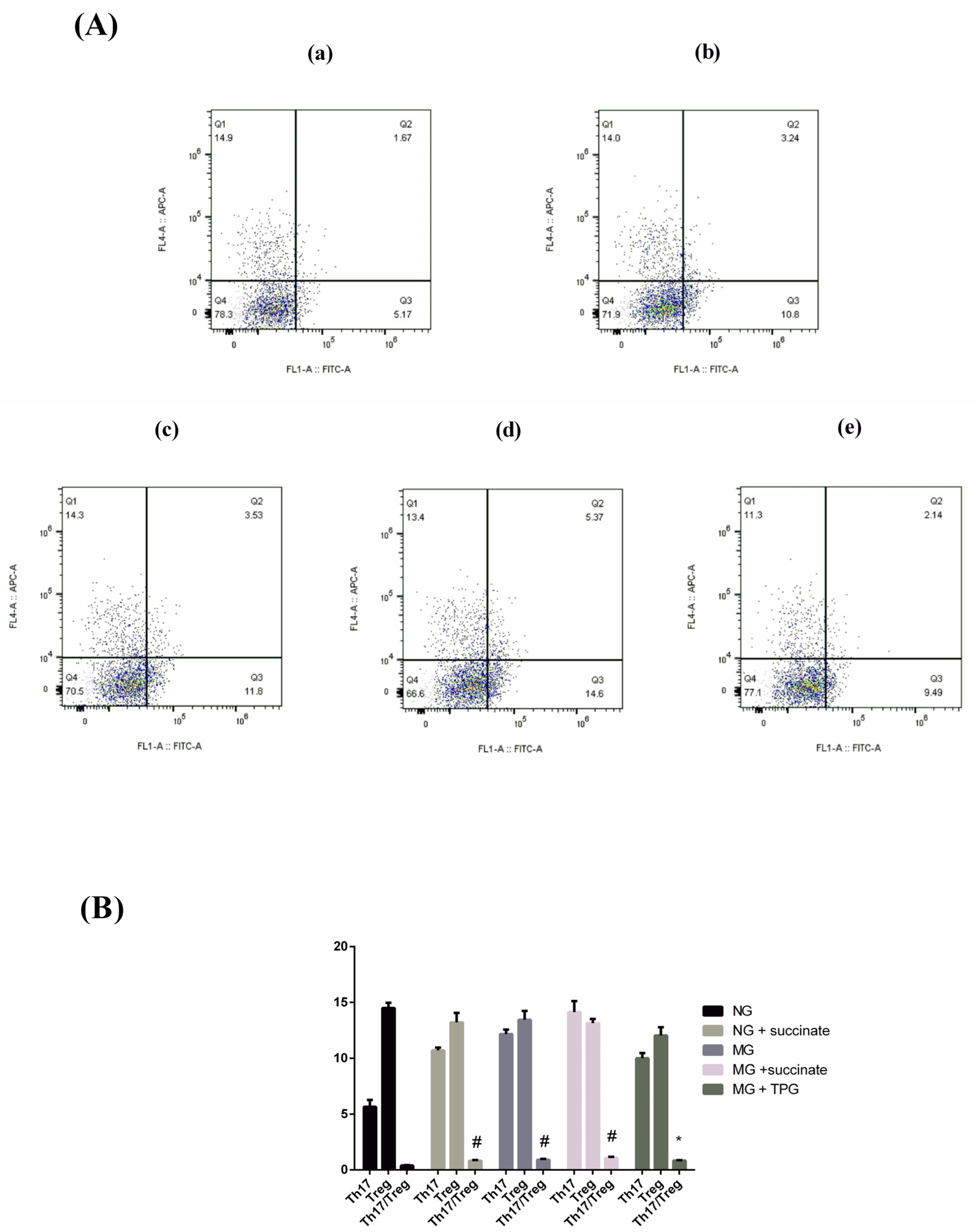 Figure 8. Effects of succinate on the Th17 and Treg cell populations in intestinal tissues across animal groups and following TPG treatment ((A) Representative flow cytometry plots: (a) NG; (b) NG + succinate; (c) MG; (d) MG + succinate; (e) MG + TPGs. LL: IL-17A/Foxp3, non-Th17/non-Treg cells; LR: IL-17A+/Foxp3, Th17 cells; UL: IL-17A/Foxp3+, Treg cells; UR: IL-17A+/Foxp3+, double-positive cells (usually a low proportion, nontargeted cell population; (B) Th17 and Treg cell frequencies. Compared with the NG, # p < 0.05; compared with the MG, * p < 0.05. n = 6). Notes: NG, normal control group; MG, model control group; TPGs, total polysaccharide and glycoside treatment group.